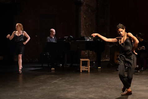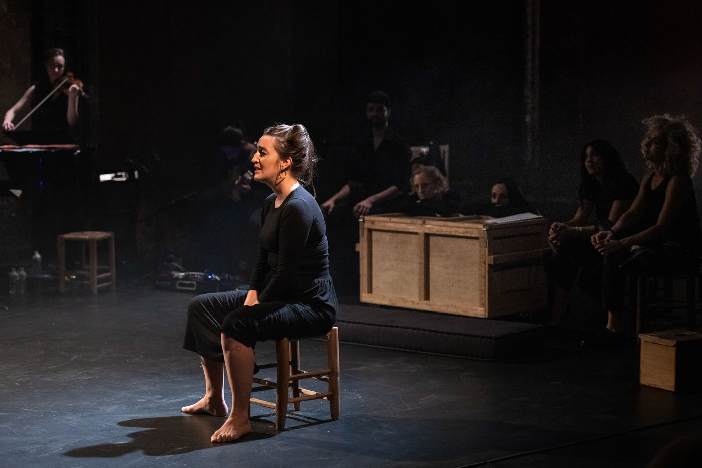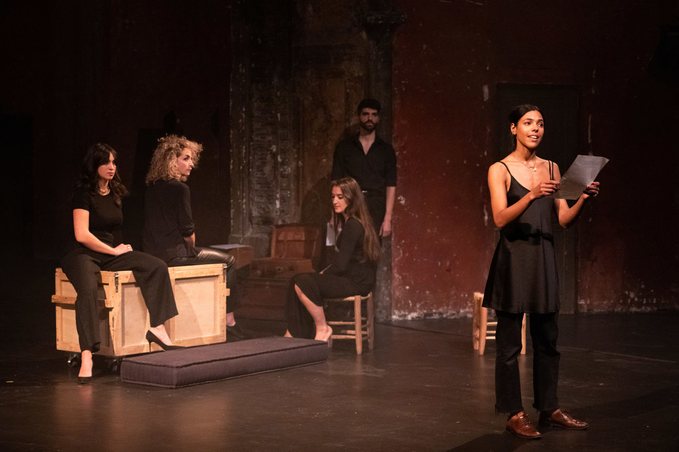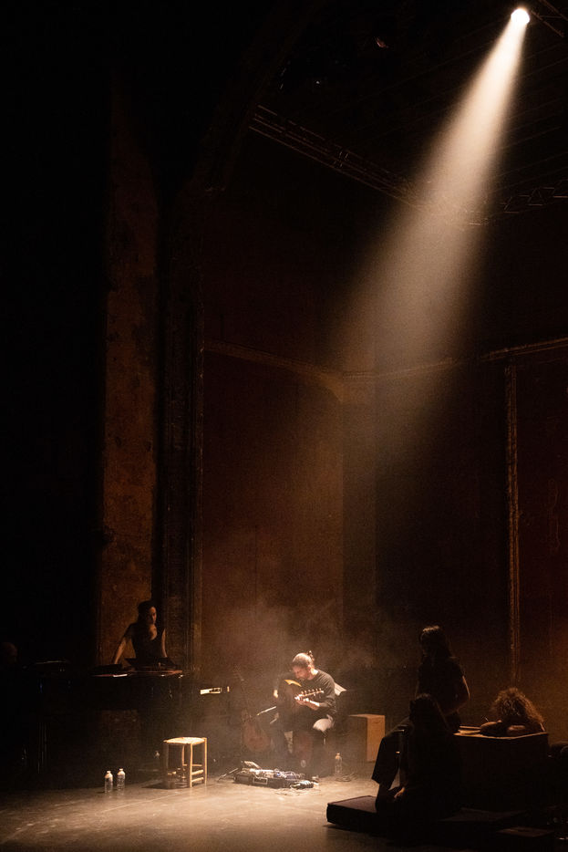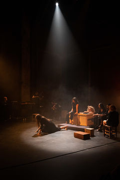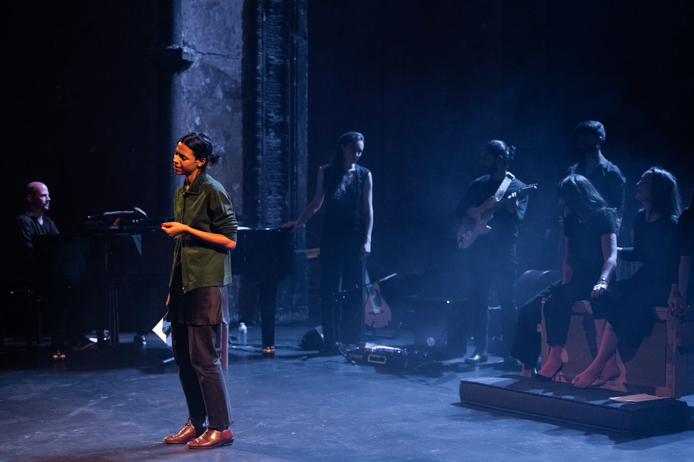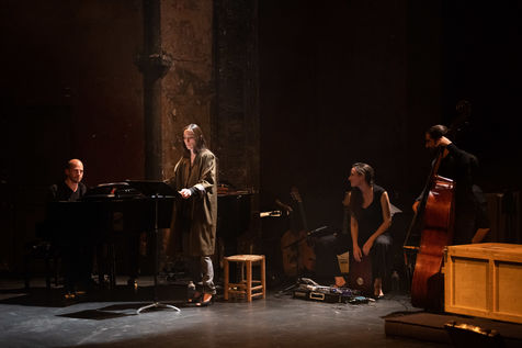 France, Paris, 2020-10-25. Andando, piece de theatre, mise en scene par Daniel San Pedro aux Bouffes du Nord. Avec Aymeline Alix, Audrey Bonnet, Zita Hanrot, Camélia Jordana, Estelle Meyer, Johanna Nizard, Liv Heym, Pascal Sangla et M hamed el Menjra.