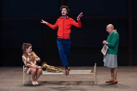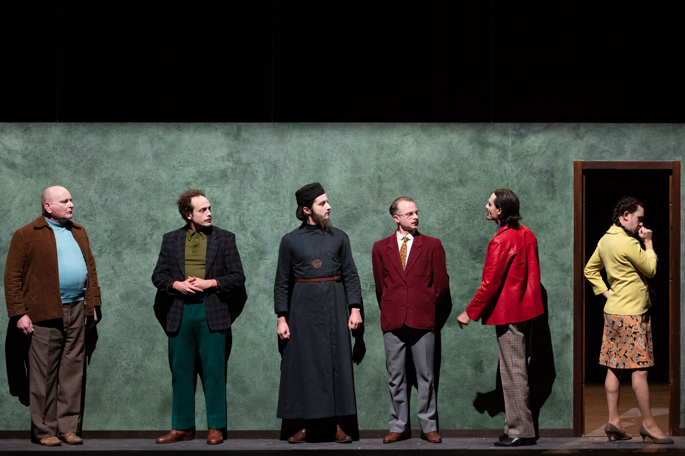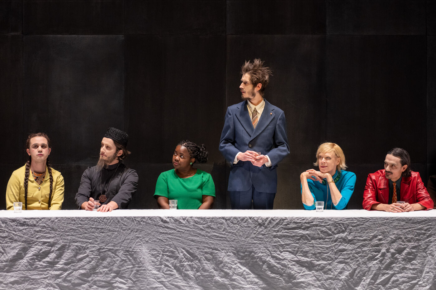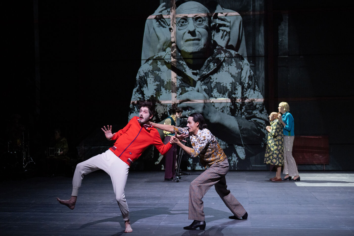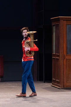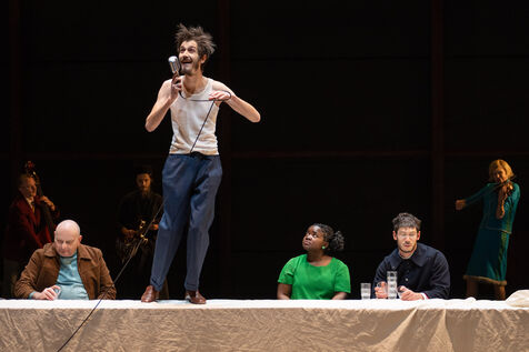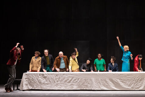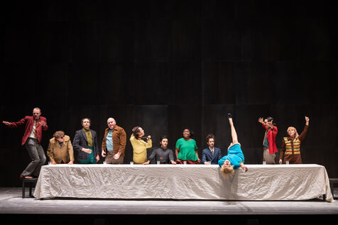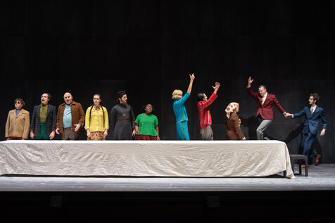 TEATER - LE SUICIDÉ, VAUDEVILLE SAUVIÉTIQUE of Nicolaï Erdman directed by Jean Bellorini, at the Theatre National Populaire, december 2022. With François Deblock, Mathieu Delmonté, Clément Durand, Anke Engelsmann, Gérôme Ferchaud, Julien Gaspar-Oliveri, Jacques Hadjaje, Clara Mayer, Liza Alegria Ndikita, Marc Plas, Antoine Raffalli, Matthieu Tune, Damien Zanoly and Tatiana Frolova.