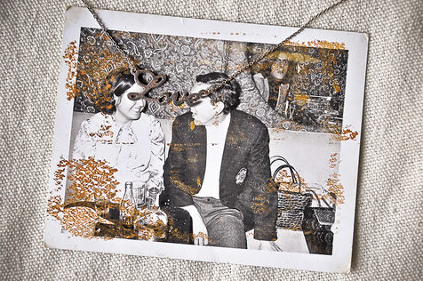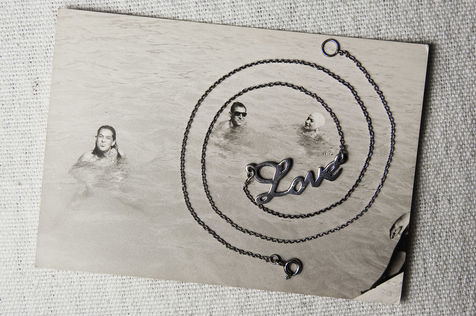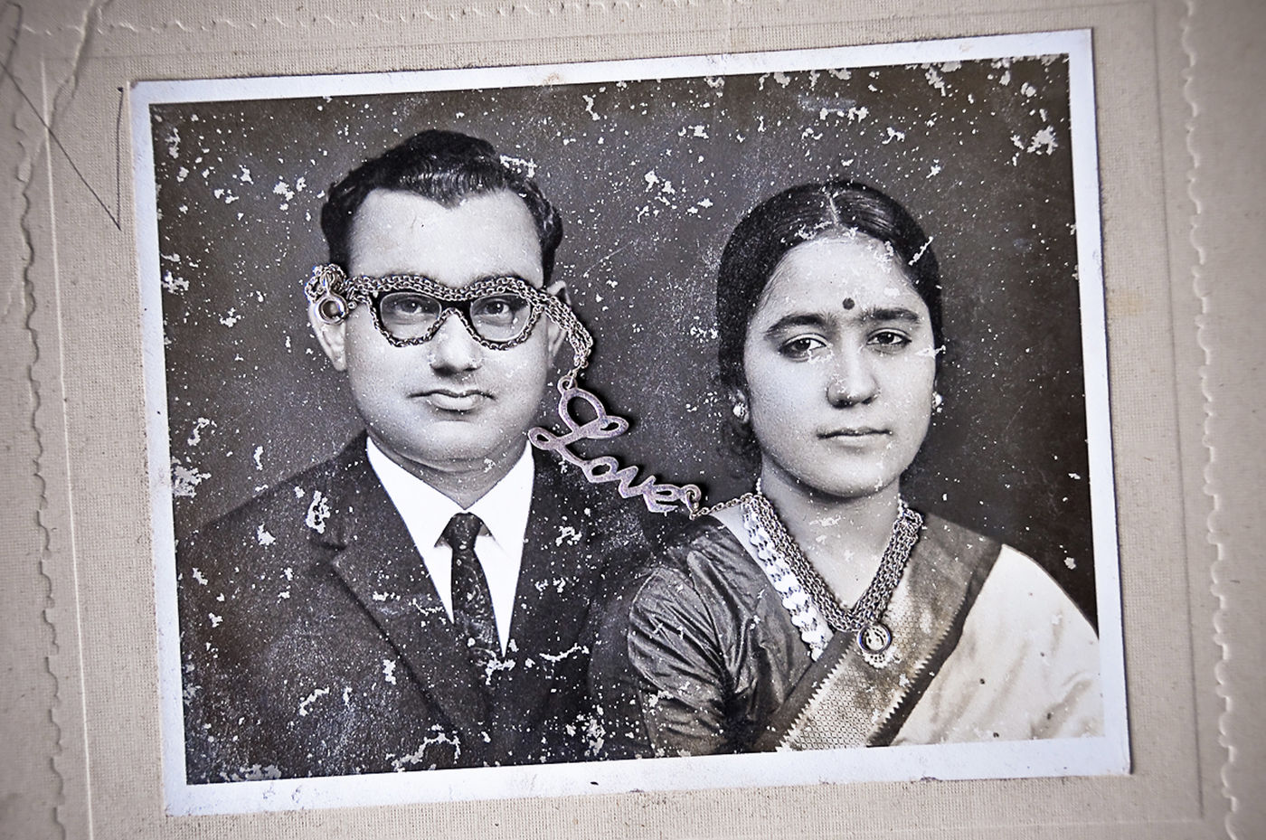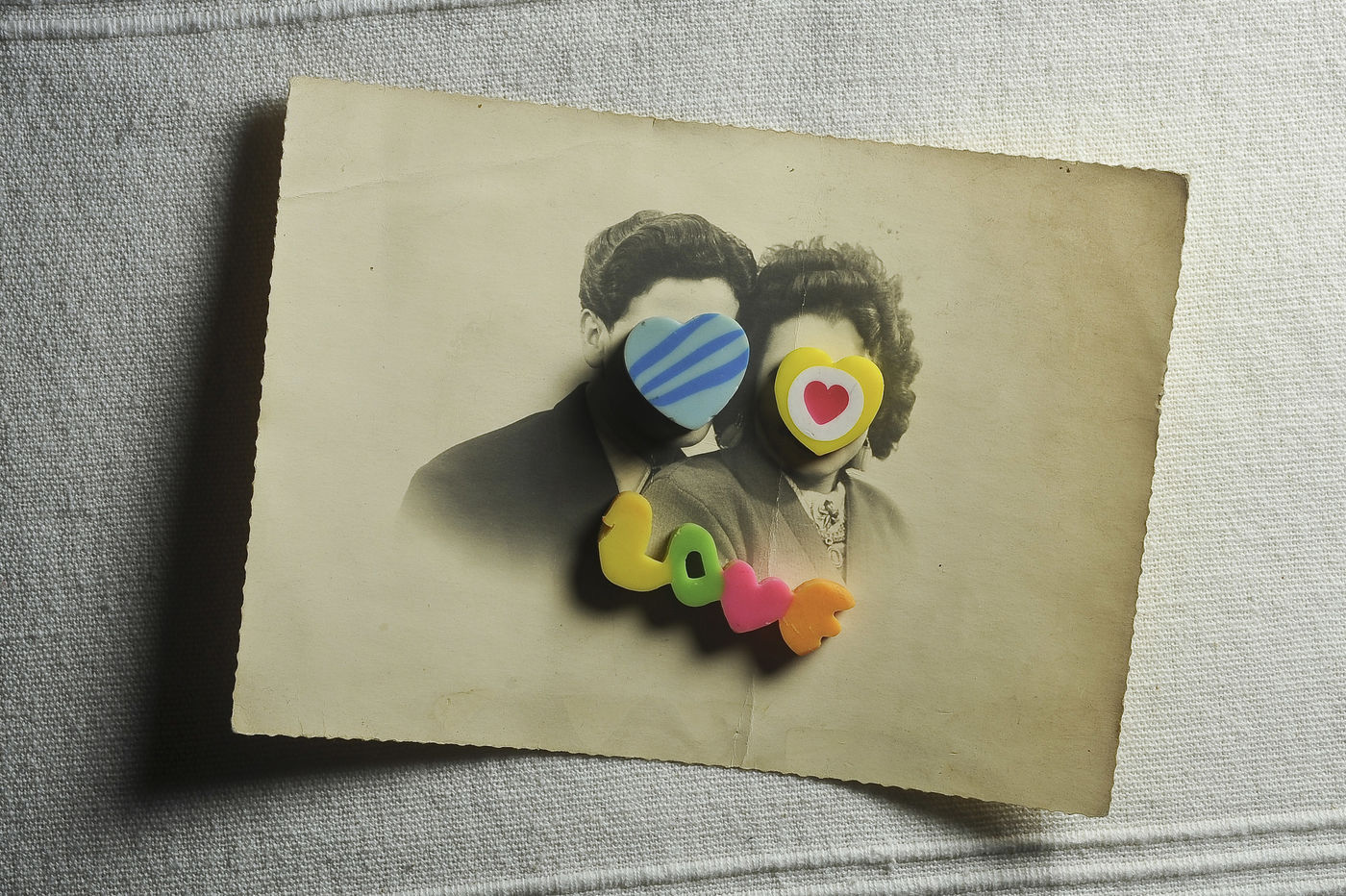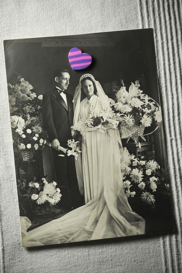 A partir de photos de couples anciennes, découvertes dans les cartons de famille ou chinées aux puces, j'ai été frappée par la diversité de l'expression du sentiment amoureux. J'ai rephotographié ces vieilles photos en y apposant un objet amplificateur du lien amoureux perçu dans l'image. Une façon pour moi de rendre hommage à l'amour qui a existé entre deux personnes, et qui continue à traverser le temps.