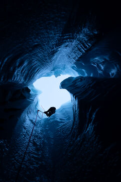 Le 2 novembre 2024, dans le cadre d'une documentation des moulins glaciaires des alpes, nous avons réalisé une descente sous le Glacier de Saint-Sorlin, sous le Pic de l'Etendard dans le massif des Grandes Rousses. Après une descente en rappel dans plusieurs gouffres de glace, nous sommes parvenus au socle glaciaire, entre roche et glace, l'eau a sculpté ce paysage souterrain.