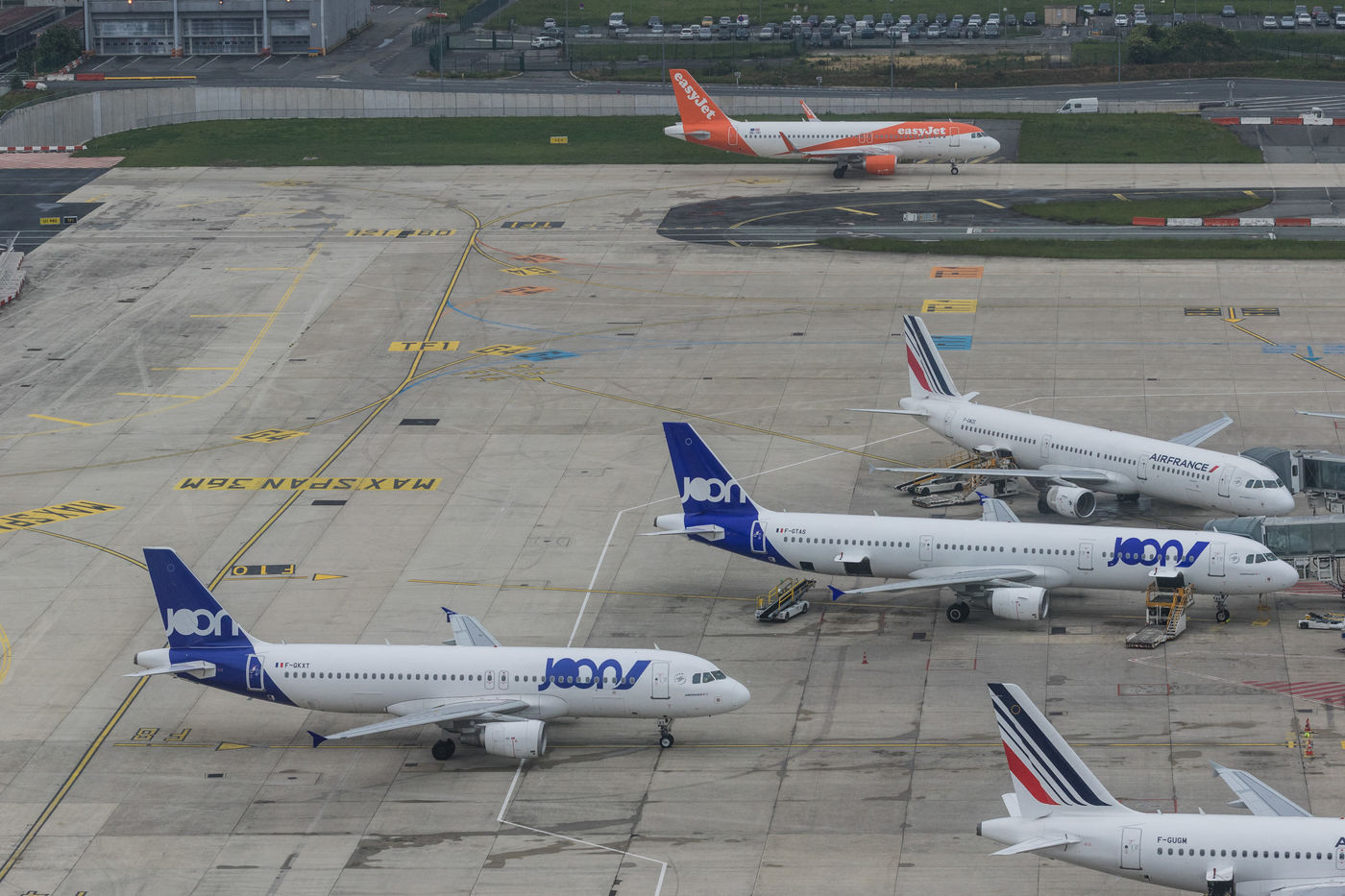 Des avions de la nouvelle compagnie JOON, filiale d'Air France, à l'aéroport Charles De Gaulle, à Roissy, près de Paris, en France, au mois de mai 2018.