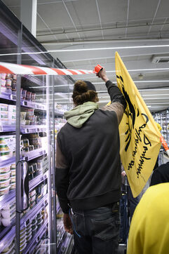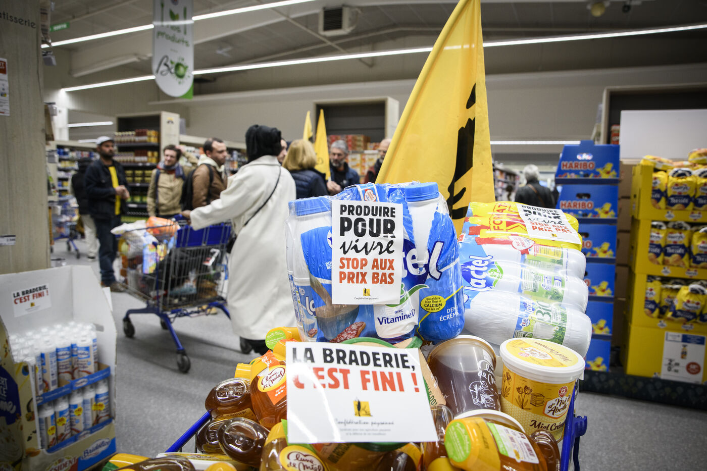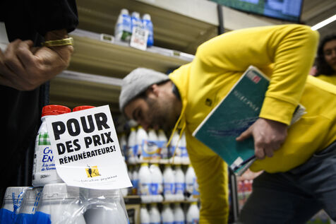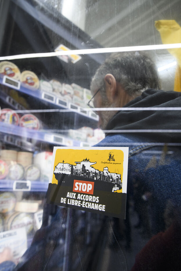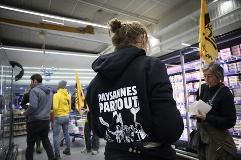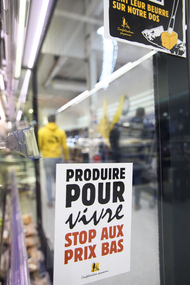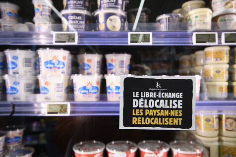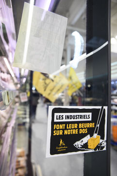 The Confédération Paysanne union went to a supermarket to put up protest stickers. The union opposes free trade agreements between South American countries and the European Union, MERCOSUR. They demand more dignified incomes, they demand peasant agriculture that respects nature.