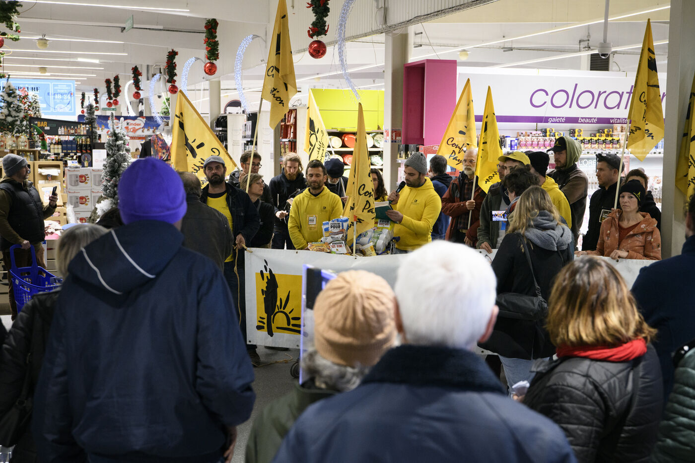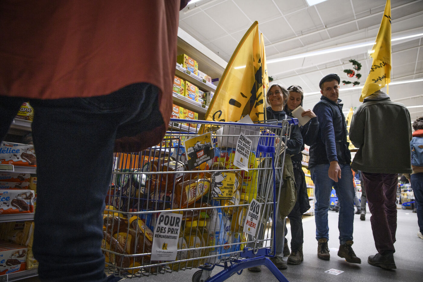 Le syndicat de la Confédération Paysanne est allé dans une grande surface pour coller des autocollants revendicatifs. Le syndicat s'oppose aux accords de libre-échange entre les pays d'Amérique du Sud et l'Union européenne, le MERCOSUR. Il revendique des revenus plus dignes, ils revendiquent une agriculture paysanne respectant la nature.