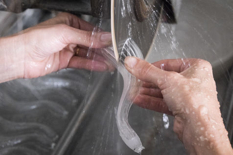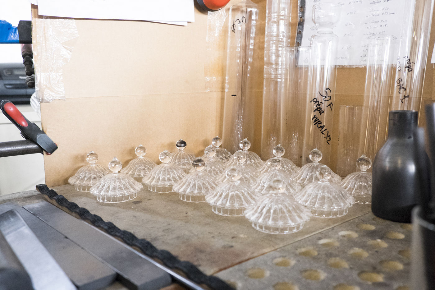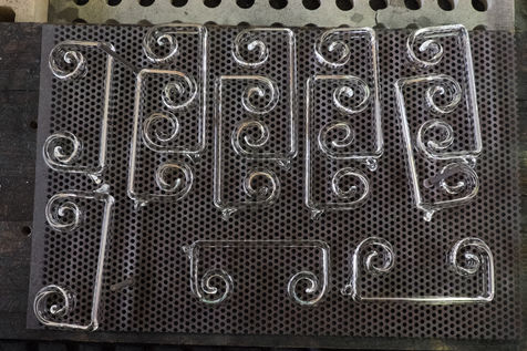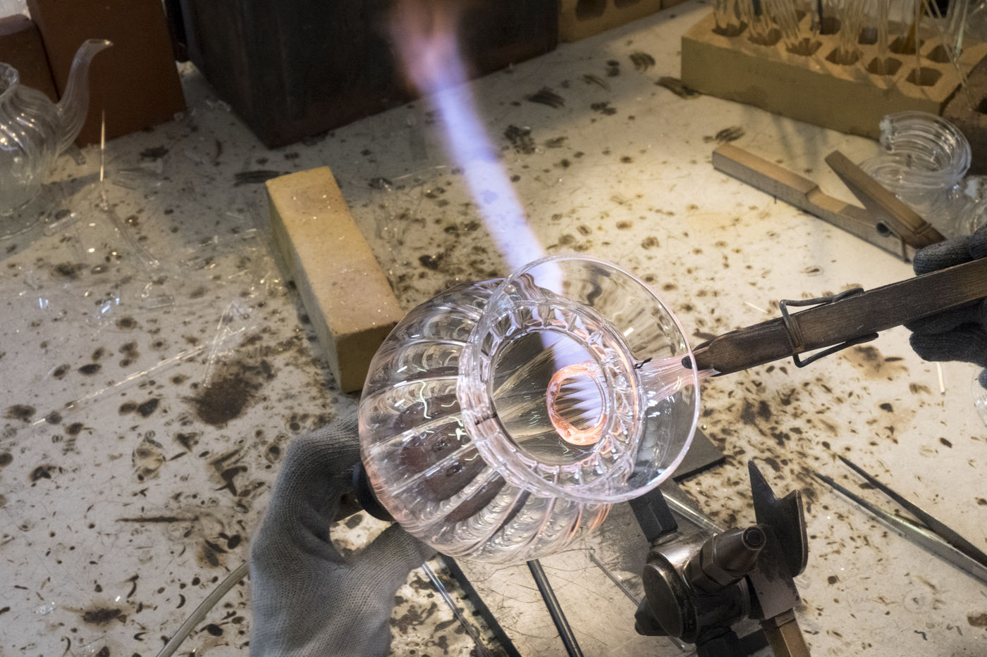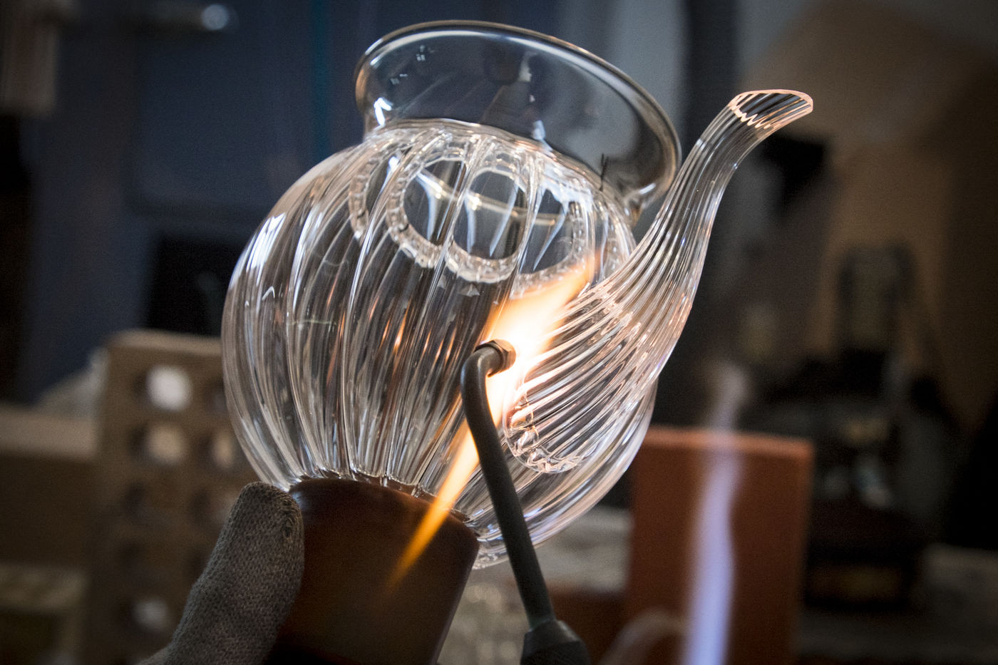 Les petites pièces qui ne sont pas fabriquées, à l'aide du tour (ex : bec de théière), sont soufflées directement à la bouche.