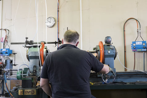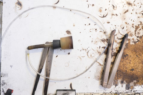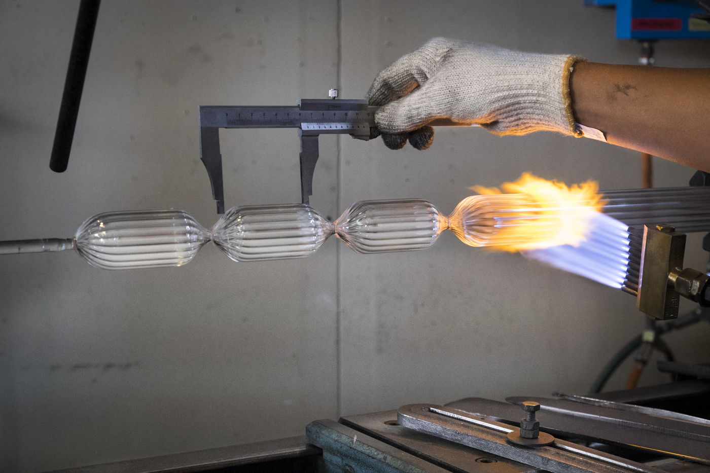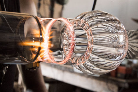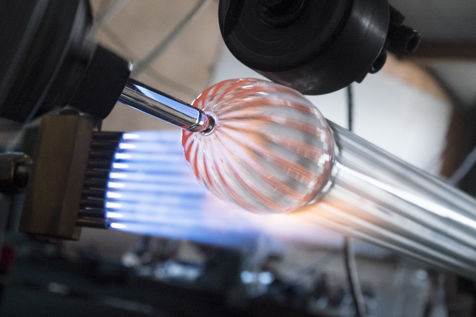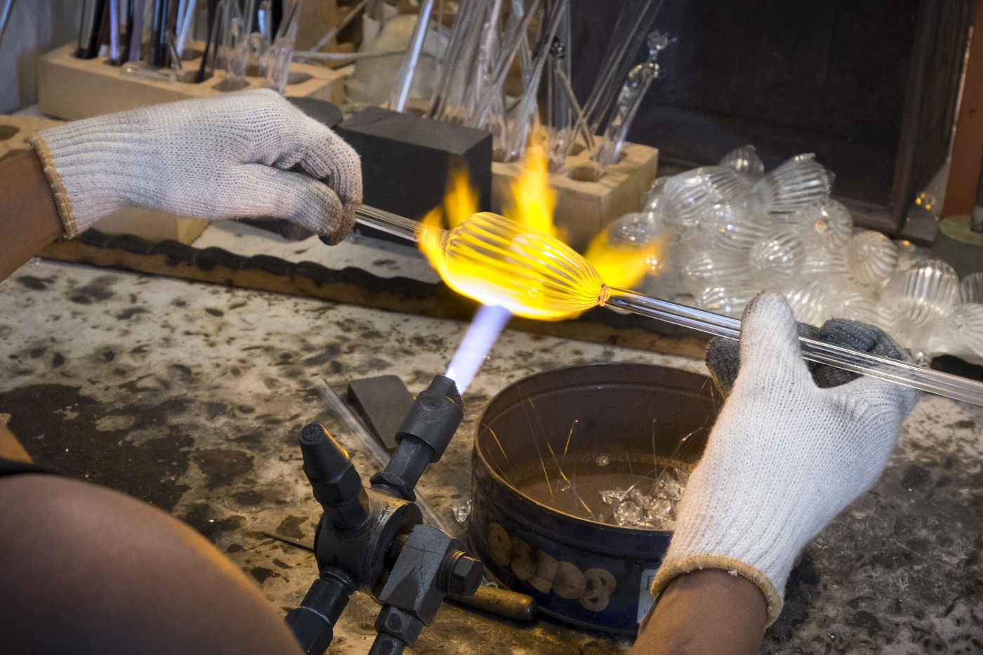 Toutes les pièces creuses sont soufflées à la bouche, lors du travail sur le tour de verrier, le petit tuyau blanc que le souffleur prend dans sa bouche, lui permet de souffler par l'intérieur de la canne de verre qui est creuse.