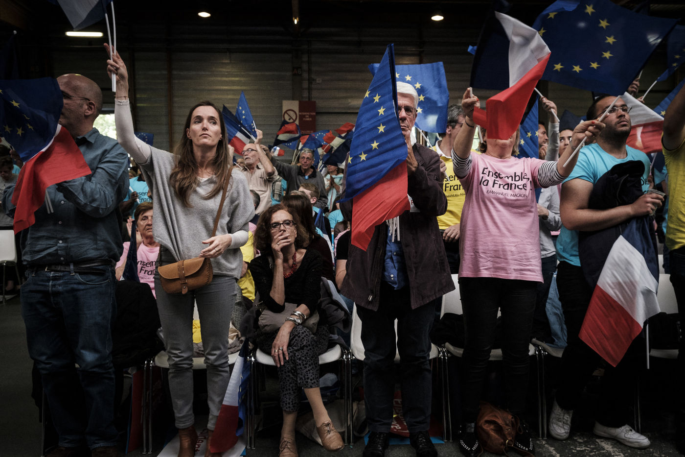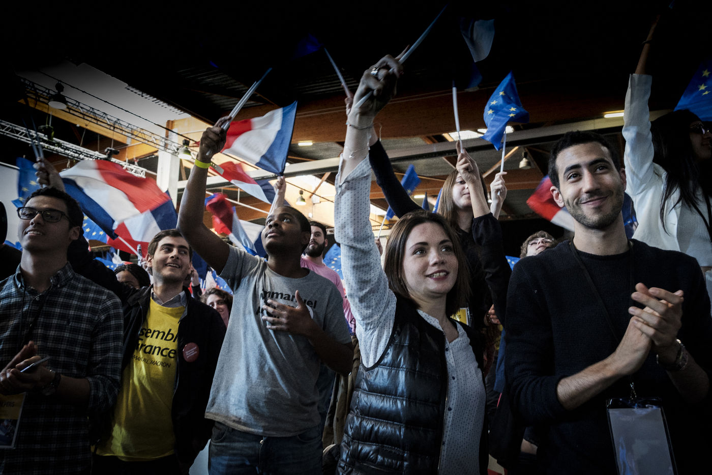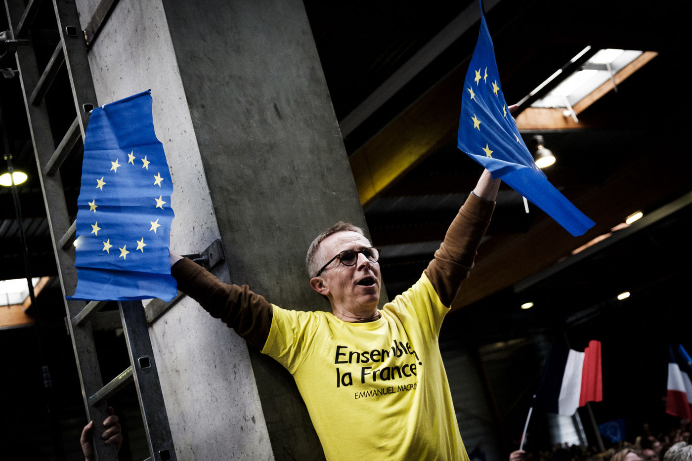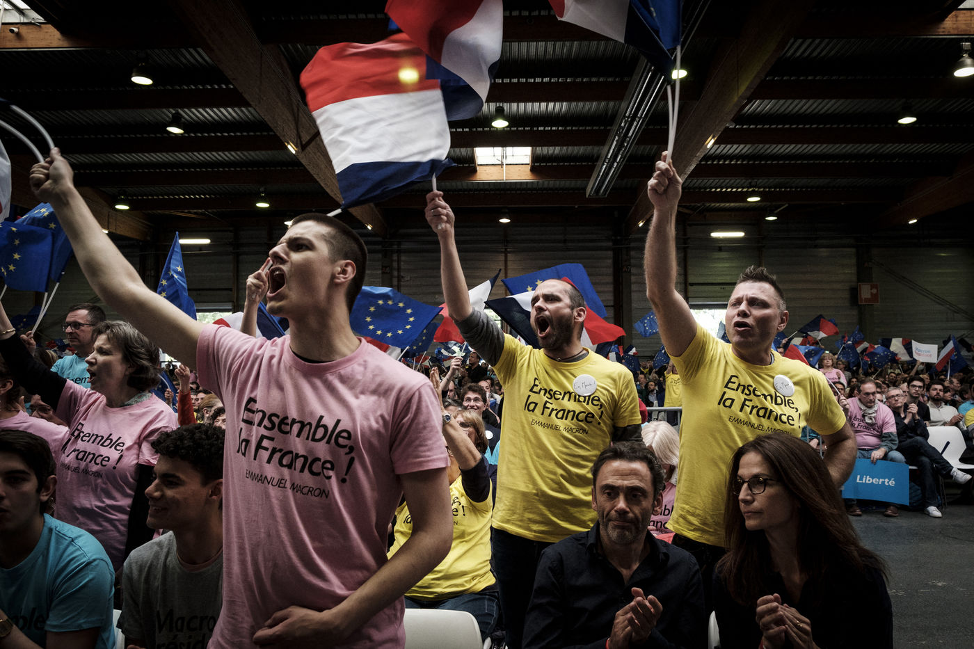 Paris, France le 1er Mai 2017 - Le candidat à l'élection présidentielle, Emmanuel Macron, lors de son meeting d'entre deux tours au Paris Event Center à La Villette.