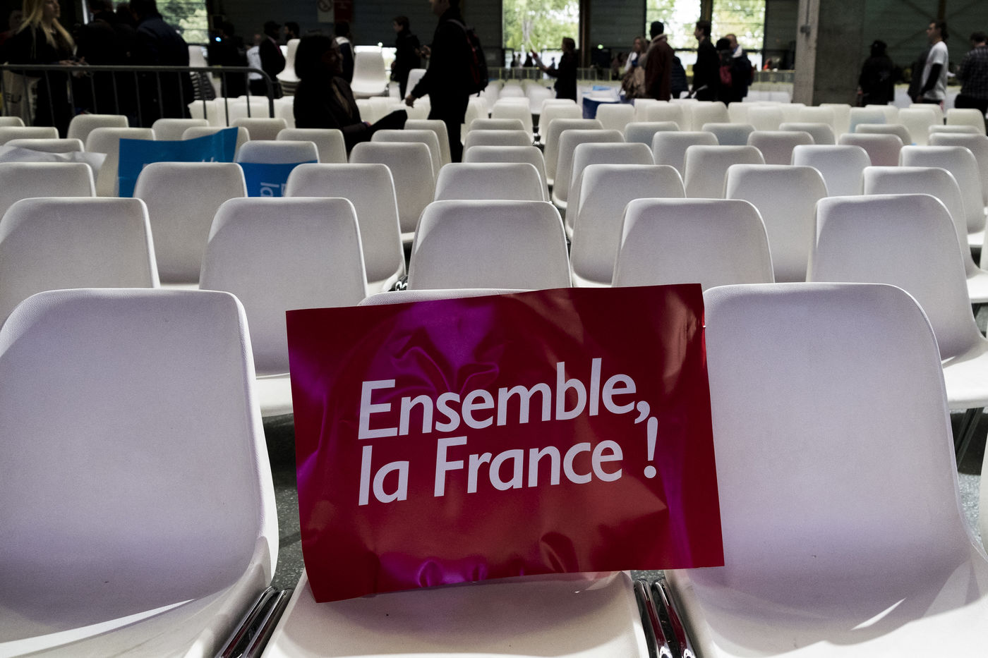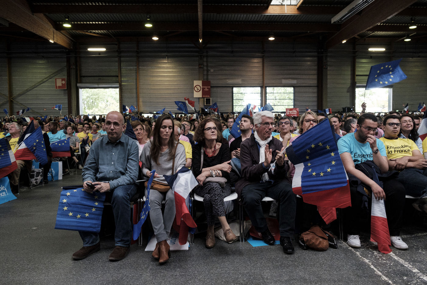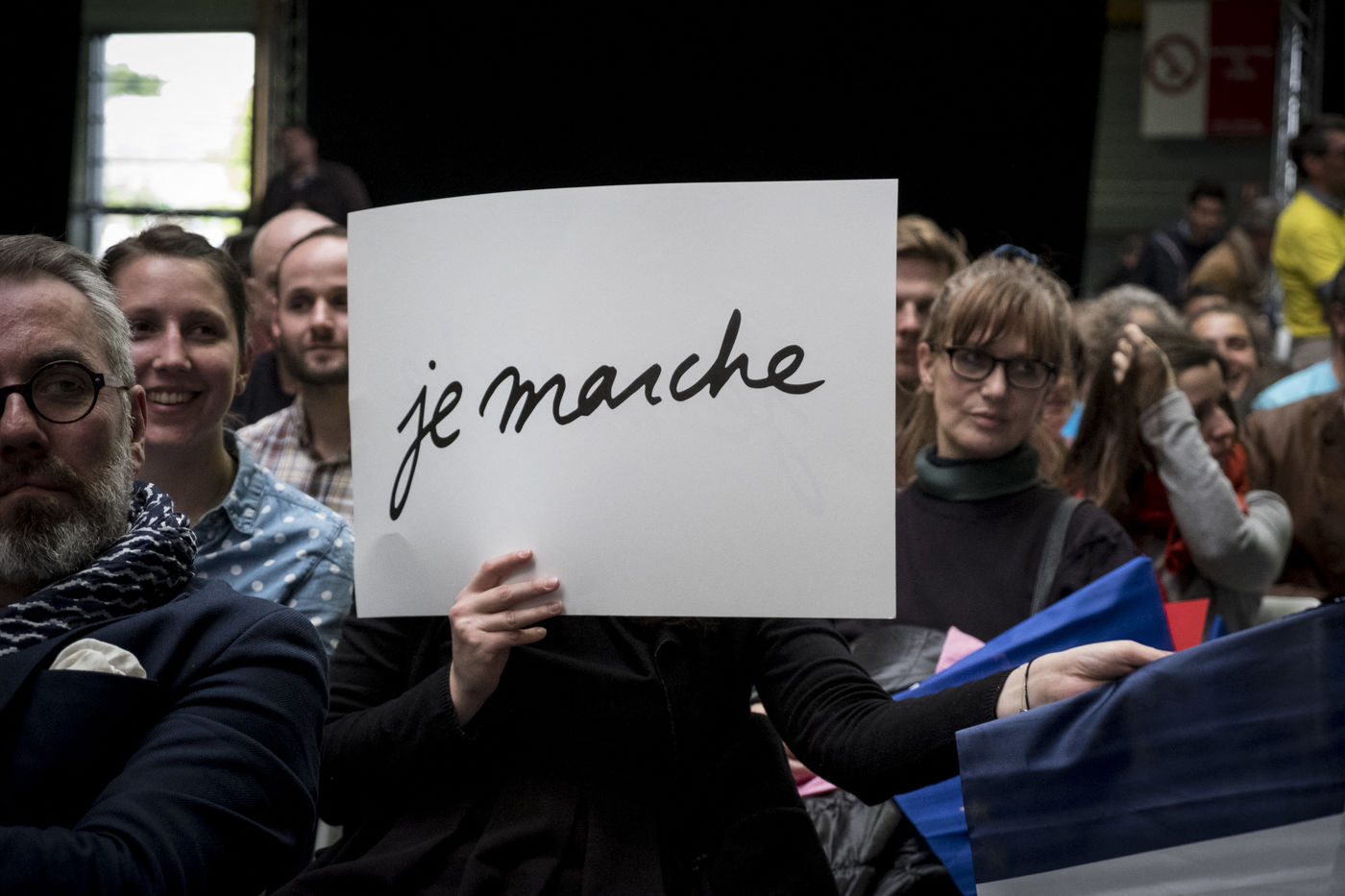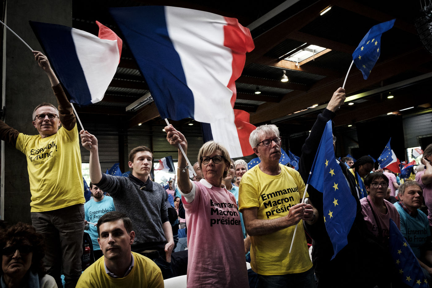 Paris, France le 1er Mai 2017 - Le candidat à l'élection présidentielle, Emmanuel Macron, lors de son meeting d'entre deux tours au Paris Event Center à La Villette.