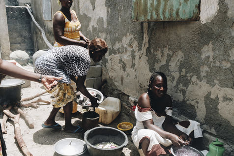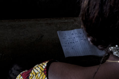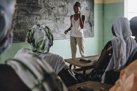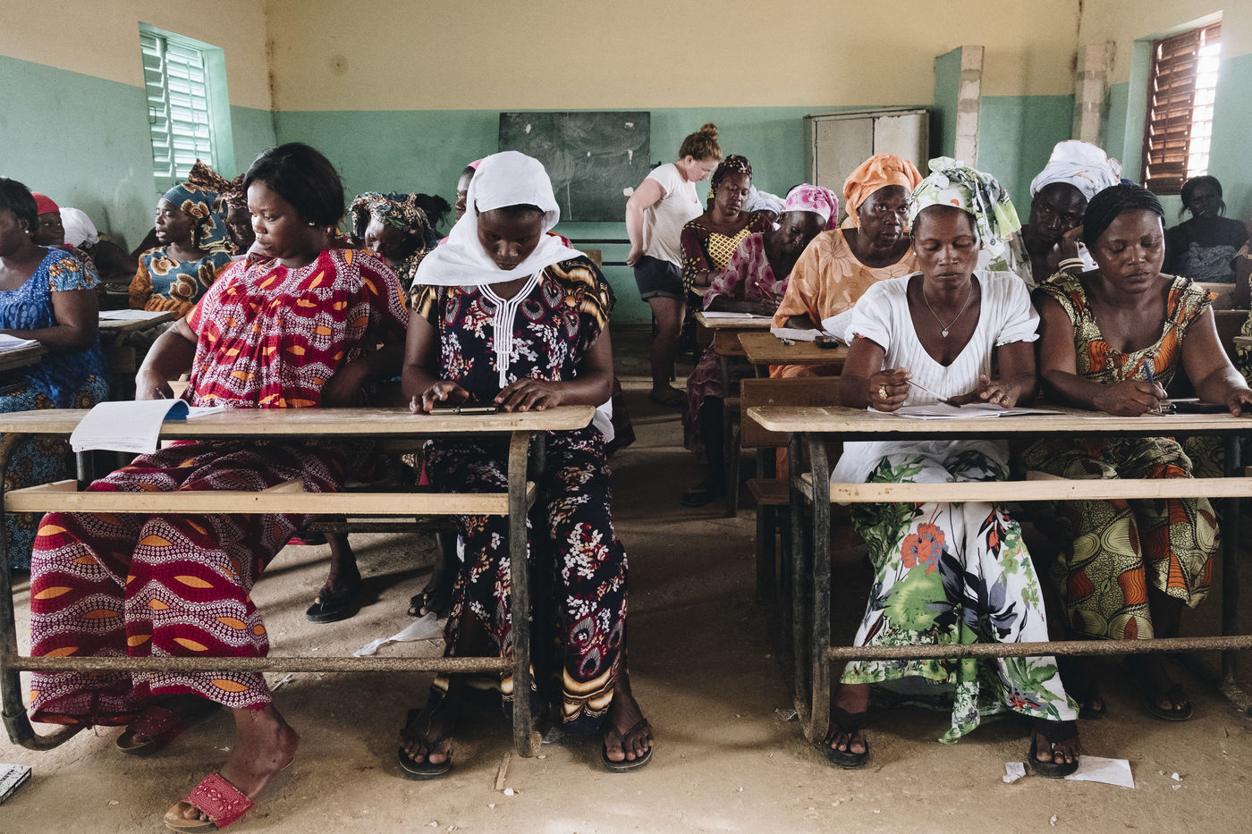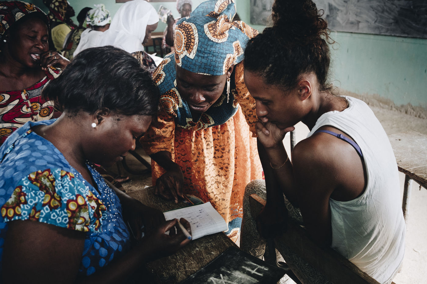 In Senegal, nearly 50% of the population is illiterate. In Diamniadio, in the Saloum region, students from the Arts et Métiers engineering school give classes to women in the village.?Sénégal, juillet 2017.