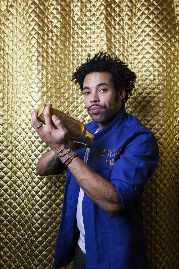 Portrait de Sullivan Doh, dans son bar à cocktails Le Syndicat, environ un an après son ouverture rue du faubourg Saint-Denis, fin 2014. Ce jeune parisien, né en 1987, intronisé Mousquetaire de l?Armagnac en septembre 2015, cherche à déringardiser l?eau de vie du Sud-Ouest et les spiritueux français en général. Le lieu s'inspire des speakeasy new-yorkais avec son allure de bar clandestin. Il fait partie des nombreux cafés à la mode qui investissent cette rue dont le visage change rapidement. Paris, France - 8 décembre 2015