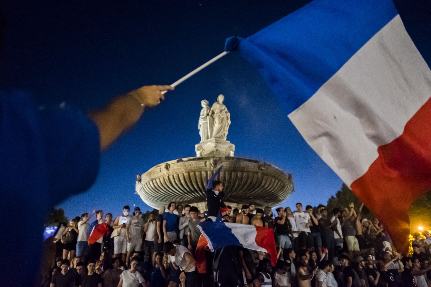 10 Juillet 2018, Manifestation de joie des supporters français après la victoire de l'équipe de France de Football face à l'équipe de Belgique 1 but a 0 en demi finale. Ici la fontaine de la rotonde à Aix en provence envahi par des supporters sur le boulevard du court Mirabeau.