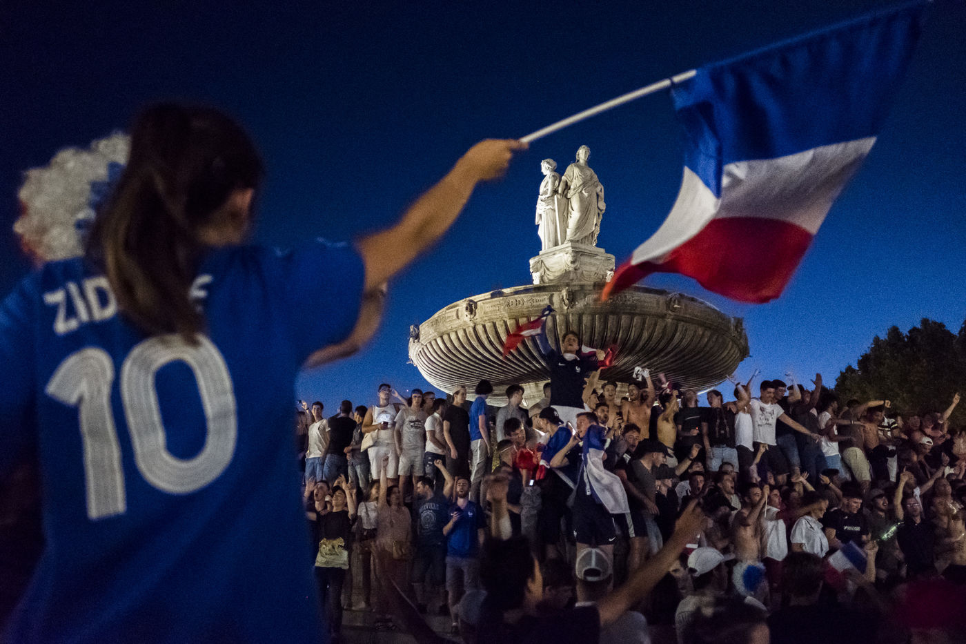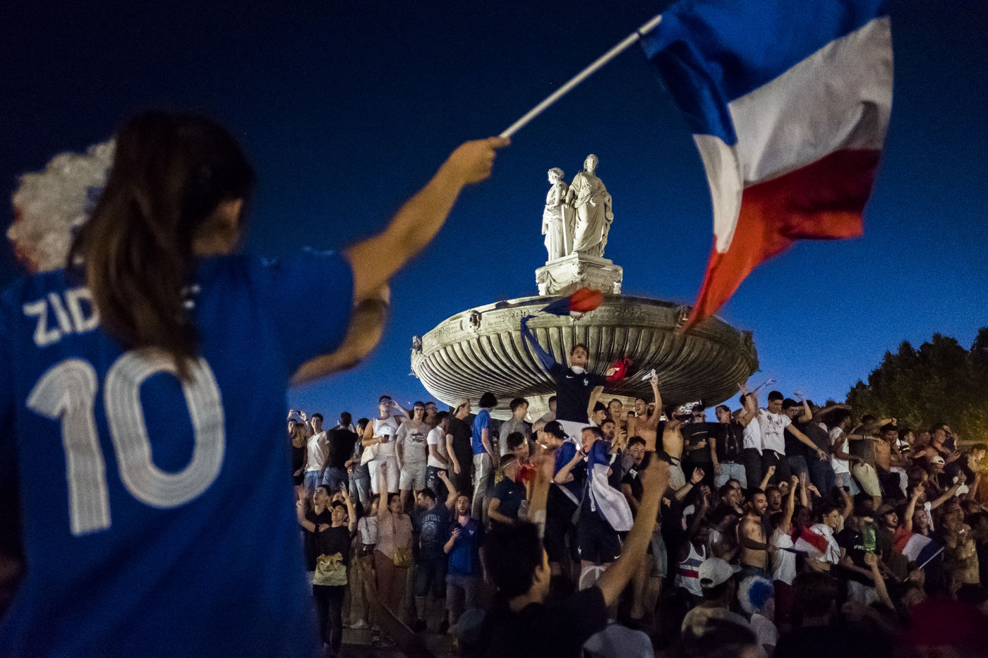 July 10, 2018, Demonstration of joy of the French fans after the victory of the French Football team against the Belgian team 1 goal to 0 in the semifinals. Here the fountain of the Rotonde in Aix en Provence invaded by supporters on the court Mirabeau.