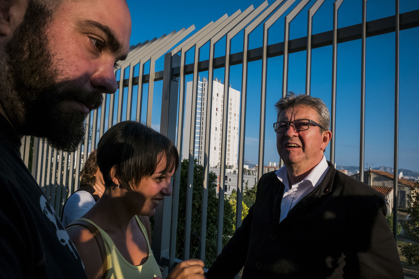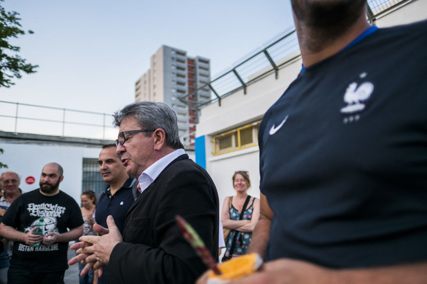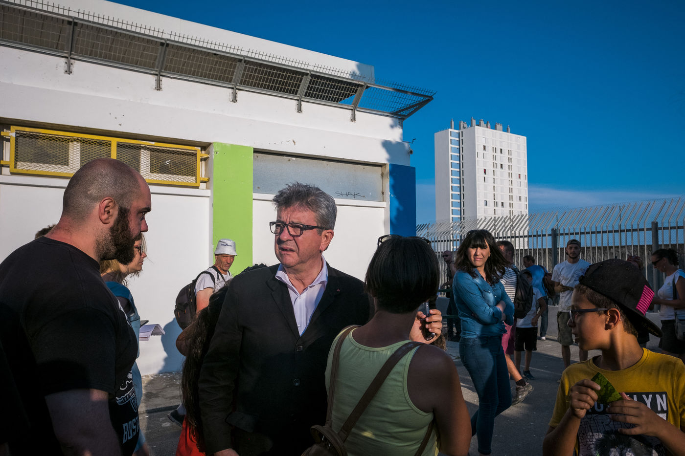 Jean-Luc Mélenchon, deputy France Insoumise, came to see the volunteers of La France Insoumise and parents of high who have participated in a renovation project of the outdoor spaces of the school group of Viste-Bousquet in Marseille, 21 July 2018 .