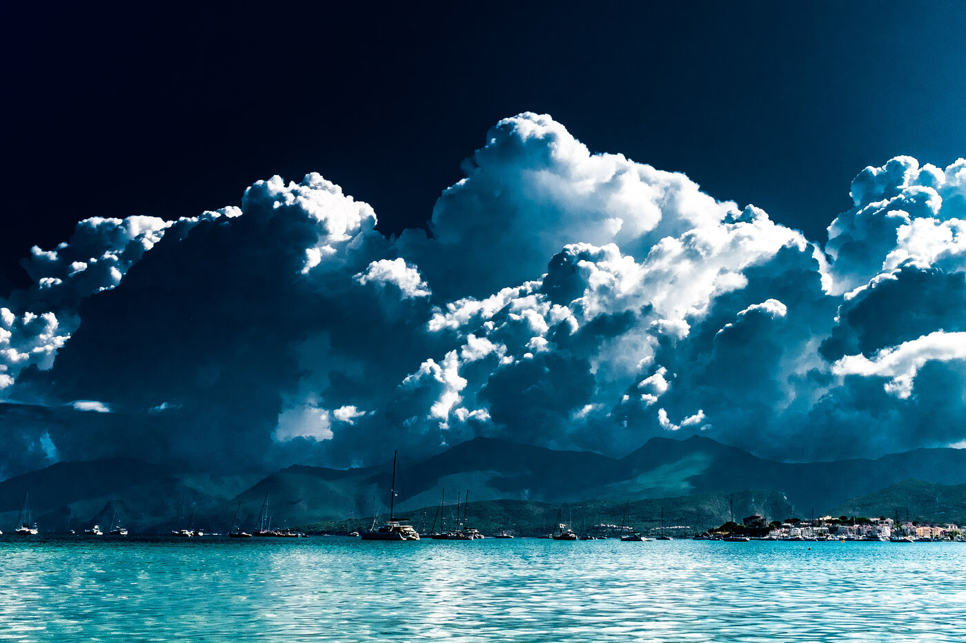 Severe weather with huge cumulonimbus clouds forming swirls atop Cap Corse. With the intense summer heat, a very large cloud and storm front is forming over the cape between Bastia and St Florent. Seen here from Roya beach in St Florent. 03/08/2025