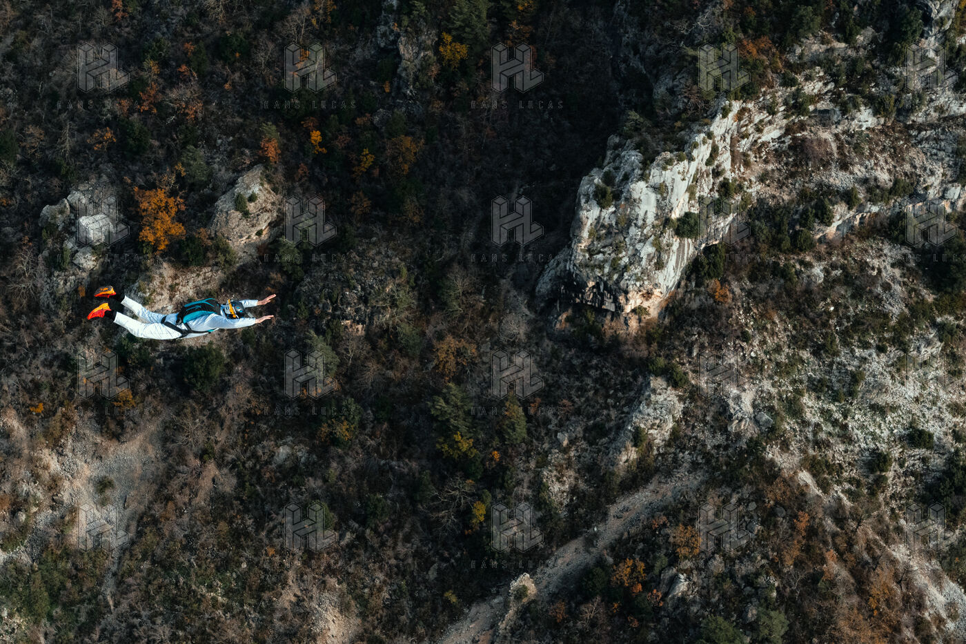 France, Moustier Sainte Marie, 9 december 2023, base jumping is a thrilling sporting activity consisting of jumping from a high point and then opening your parachute. Photograph by Louai Barakat / Hans Lucas.