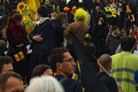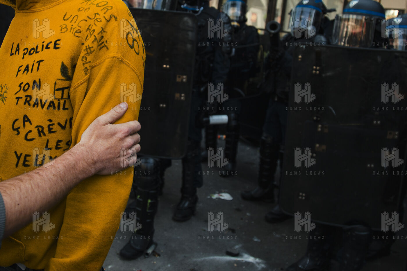 France, Paris, May 01, 2019, Multiple groups get together for a libertarian march ahead of the main demonstrations in Paris earlier today. Last year saw the politically charged march against the governments unpopular pensions reforms become increasingly violent. Photograph by Louai BARAKAT / Hans Lucas.