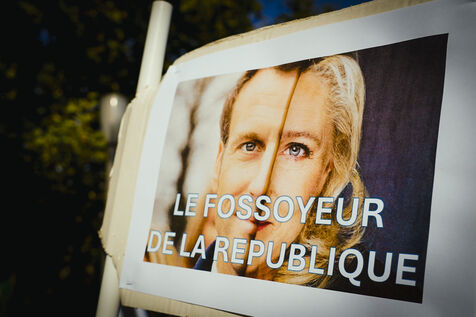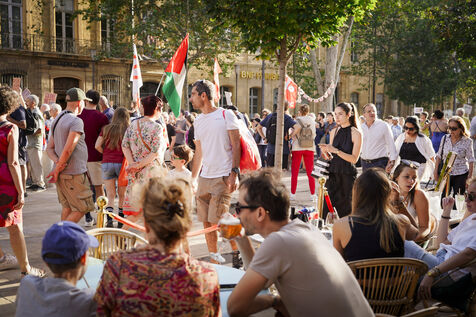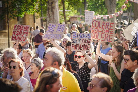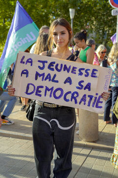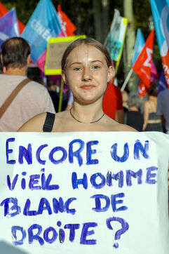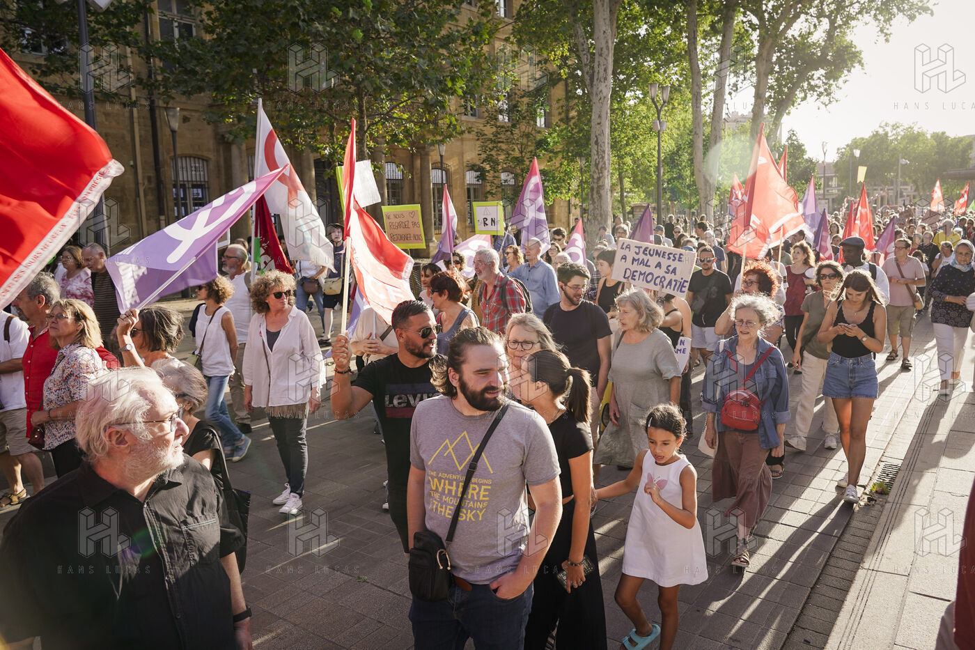 Des gens participent à une manifestation contre la nomination du Premier ministre de droite Michel Barnier par le président français Emmanuel Macron à Aix-en-Provence, dans le sud de la France, le 7 septembre 2024. Des manifestations à l'échelle nationale ont lieu le 7 septembre, menées par les dirigeants politiques de la coalition de partis de gauche française, ainsi que par les syndicats, pour dénoncer le président français pour ne pas avoir nommé un Premier ministre de gauche après avoir pris le risque de dissoudre le Parlement en juin et d'avoir convoqué des élections anticipées en juillet au cours desquelles son alliance centriste a perdu sa majorité relative au Parlement. LOUAI BARAKAT / HANS LUCAS