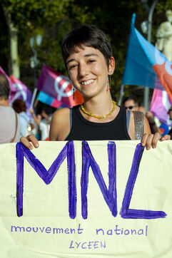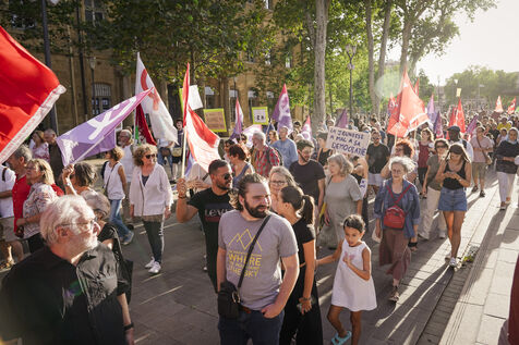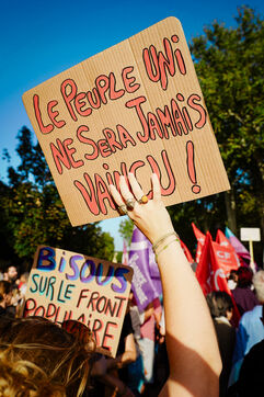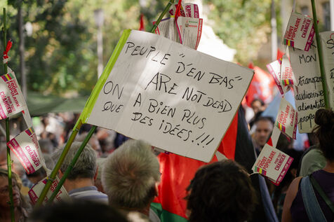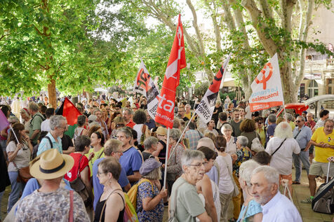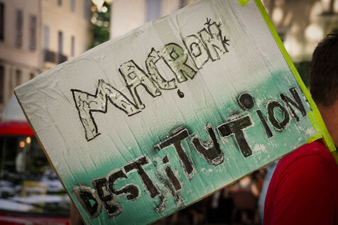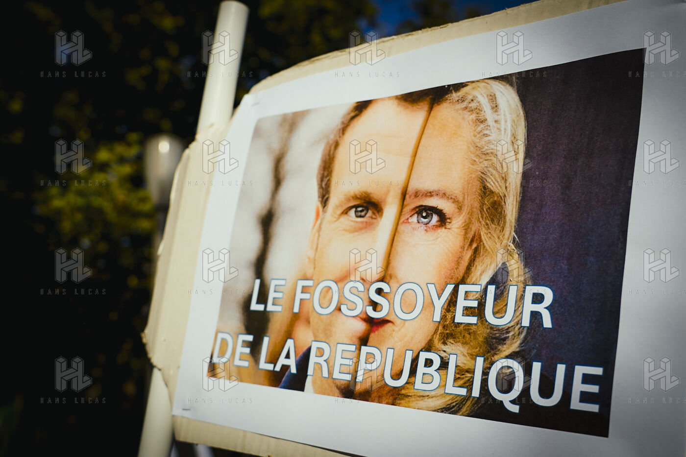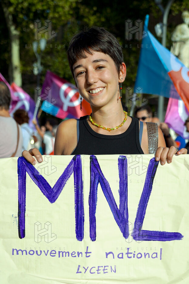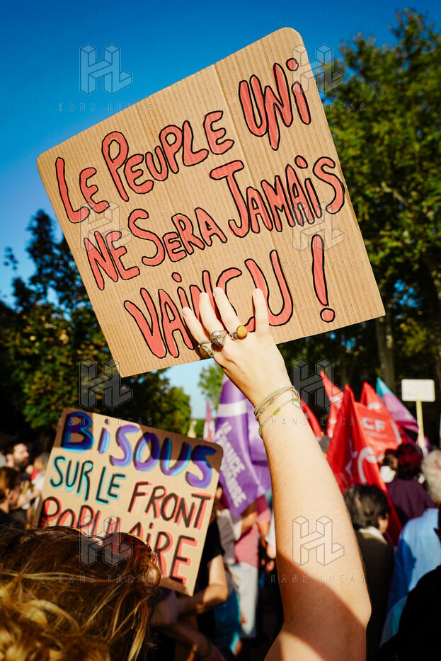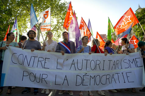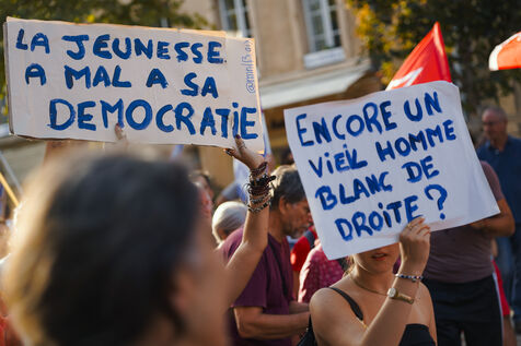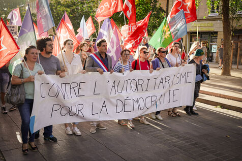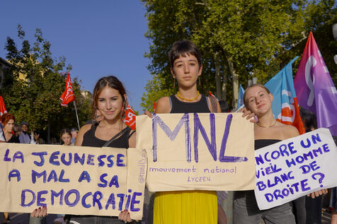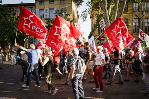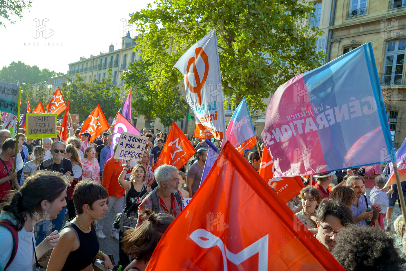 People take part in a demonstration against the appointment of right-wing Prime Minister Michel Barnier by French President Emmanuel Macron in Aix-en-Provence, southern France, on September 7, 2024. Nationwide protests are taking place on September 7, led by political leaders from France's coalition of left-wing parties, as well as trade unions, to denounce the French president for failing to appoint a left-wing prime minister after risking dissolving parliament in June and calling early elections in July in which his centrist alliance lost its relative majority in parliament. LOUAI BARAKAT / HANS LUCAS