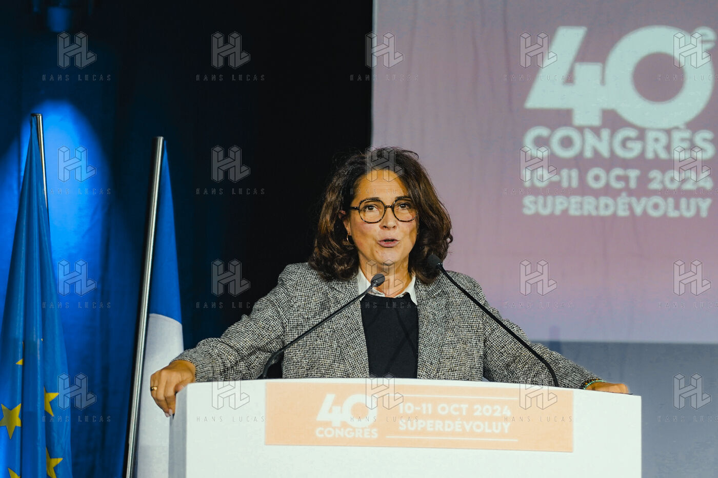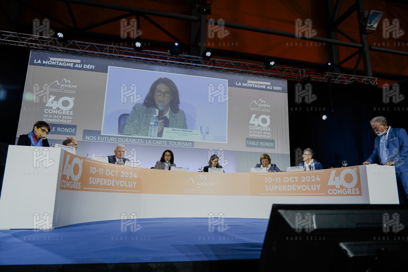 At the 40th congress of the Association Nationale des Élus de la Montagne, ministers Françoise Gatel and Marina Ferrari focused on rural and tourism development projects, with an emphasis on water management and sustainable transition in the Hautes-Alpes. Discussions included exchanges with local elected officials on the future of infrastructure and tourism in the mountains, emphasizing the importance of water for rural and tourist areas. Photograph by Louai BARAKAT / Hans Lucas.