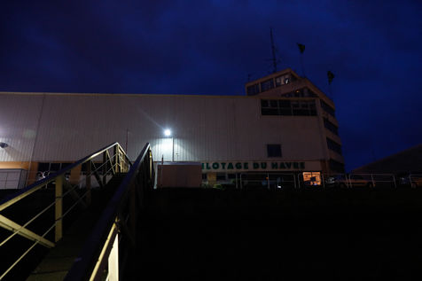 Nuit noire, échelle de corde, salle des commandes, face aux lumières du Havre qui dessinent la ville.