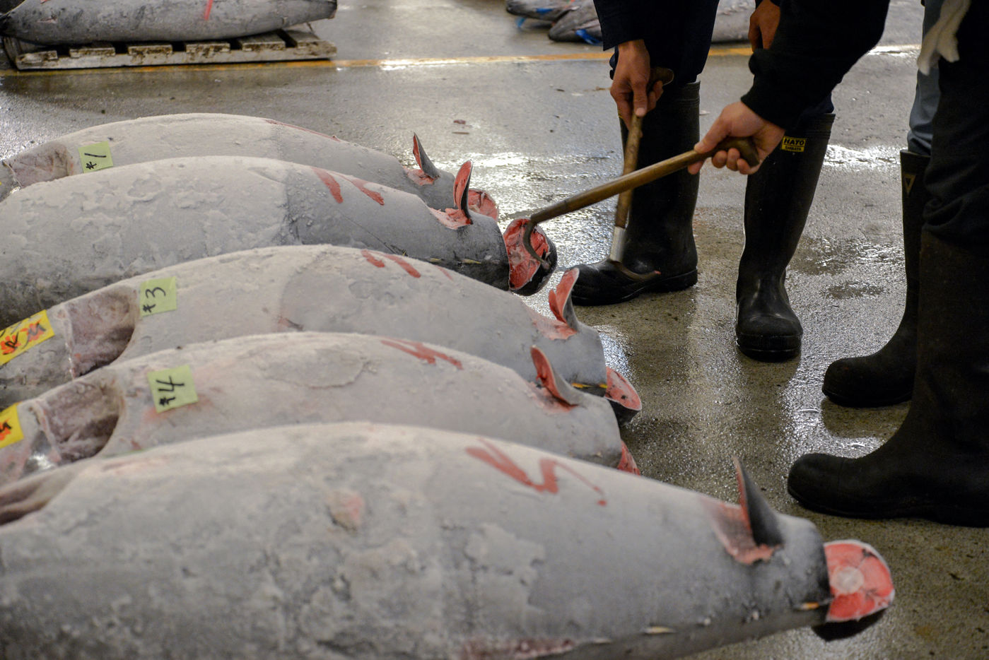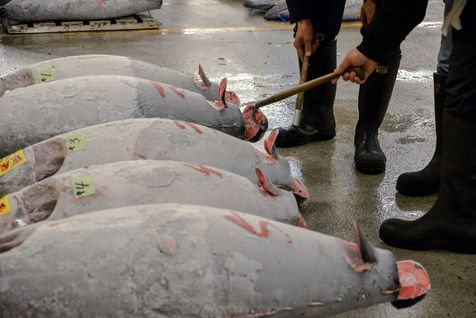 Japon, Tokyo, Tourisme, janvier 2017 - Reportage matinal à Tsukiji, le plus grand marché aux poissons au monde, à l'occasion d'une vente aux enchères de thon. Créé en 1935, le marché de Tuskiji ferme définitivement ses portes le 6 octobre pour rouvrir le 11 à Toyosu, dans un lieu moins pittoresque mais aux normes hygiéniques bien plus modernes.
