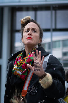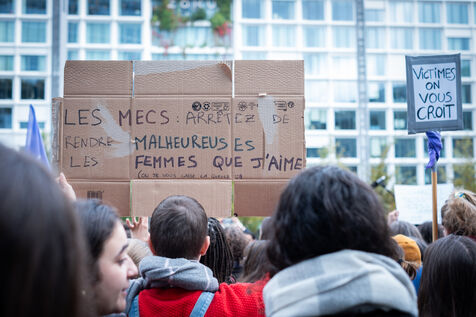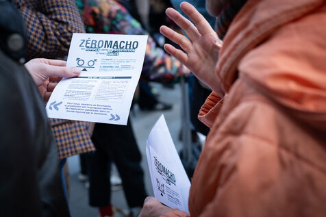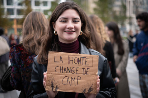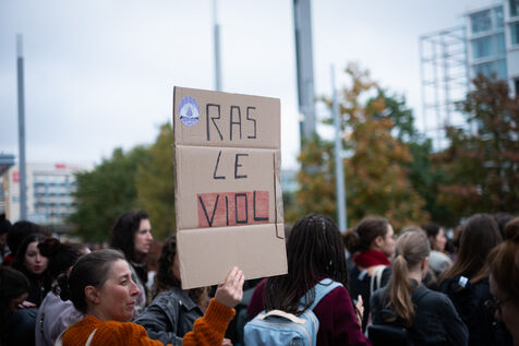 Des activistes et militant.es se rassemblent devant le tribunal de justice en soutien aux victimes de Gérard Depardieu ainsi que toutes les victimes de violences et harcèlements sexistes et sexuels, durant le procès de l'acteur, jugés pour agressions sexuelles par deux femmes.
