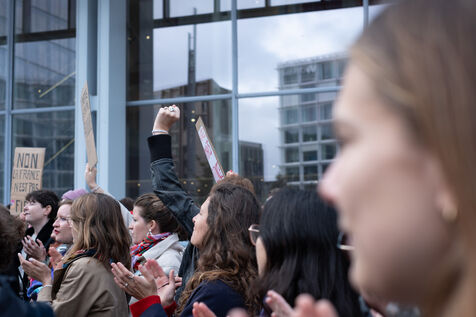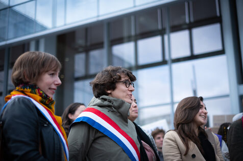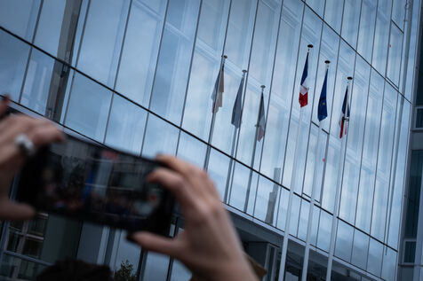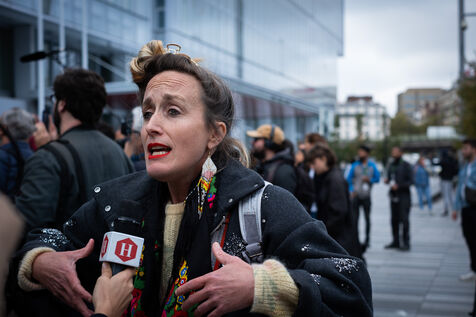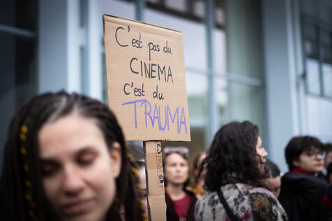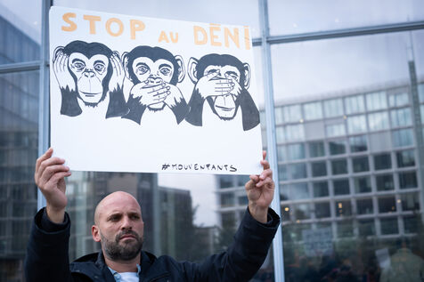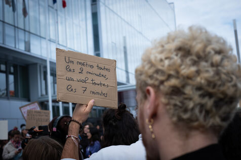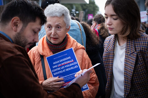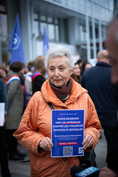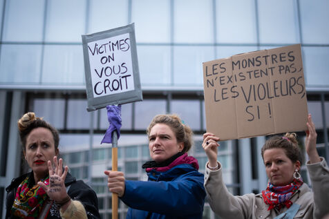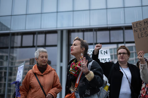 Activists and supporters gather in front of the court of justice in solidarity with the victims of Gérard Depardieu, as well as all victims of gender-based and sexual violence and harassment, during the actor's trial, where he is being judged for sexual assault by two women.