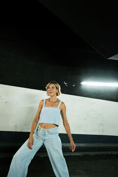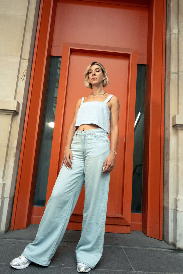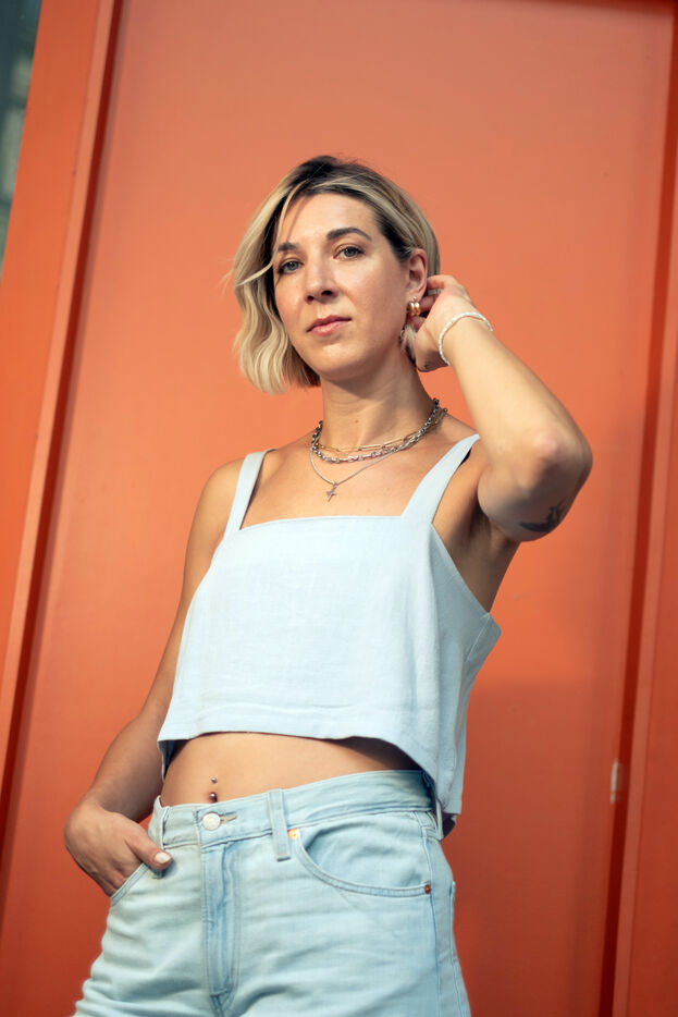 Portrait of Camille Lorente, comedian and content creator: journalist turned stand-up comedian, podcaster and videographer in Paris France on June 26 2025.