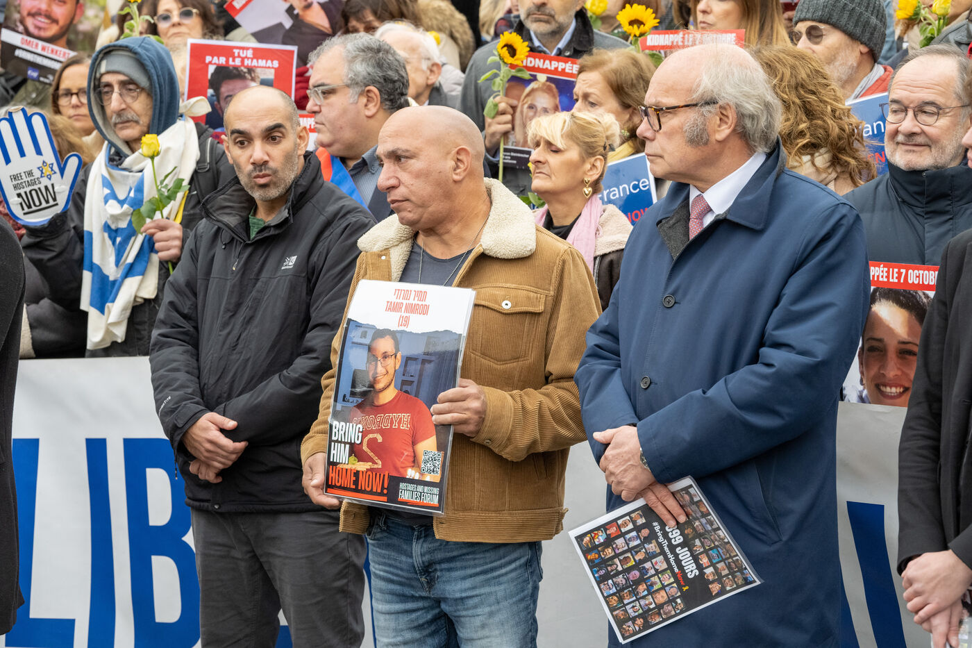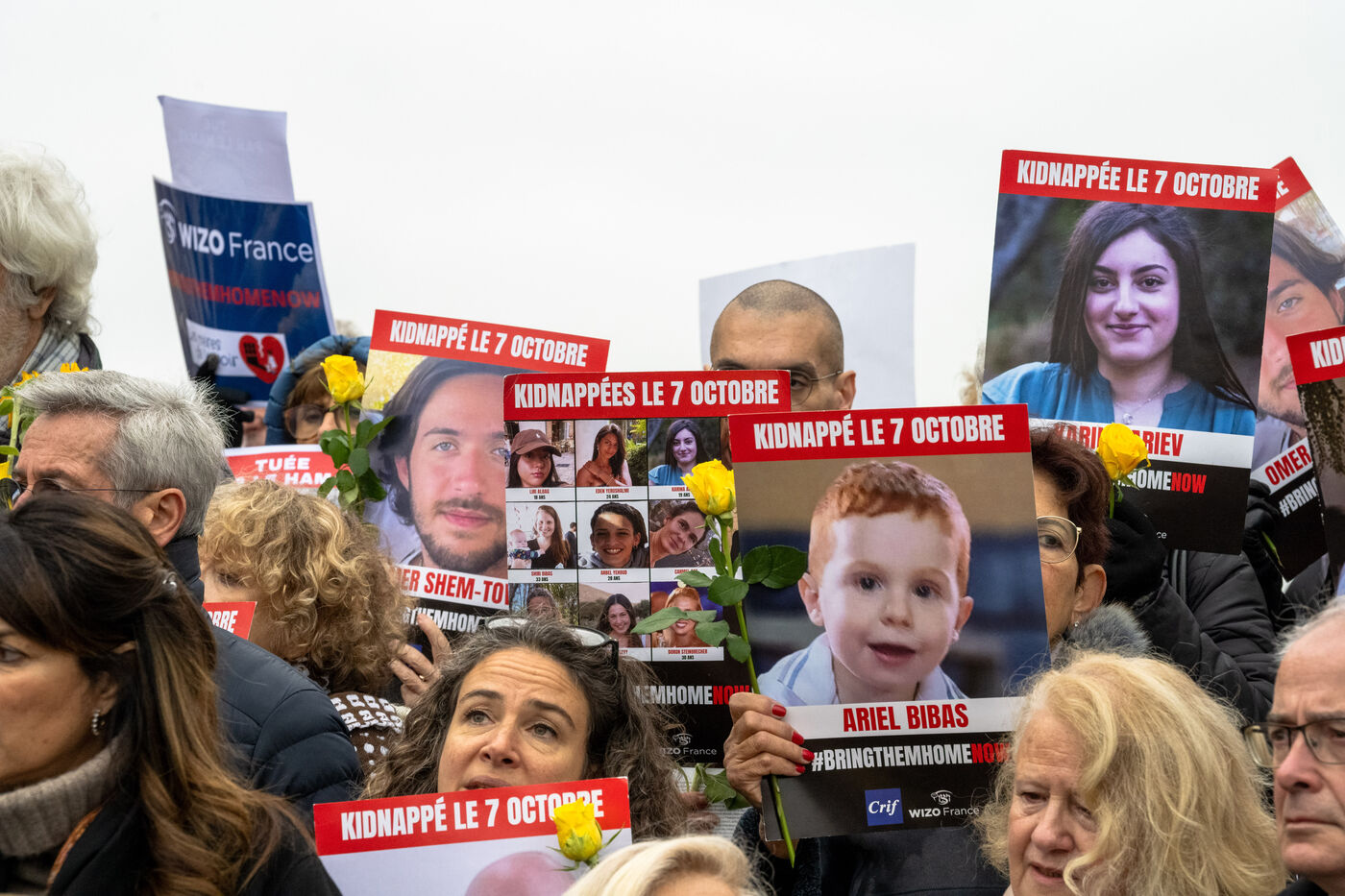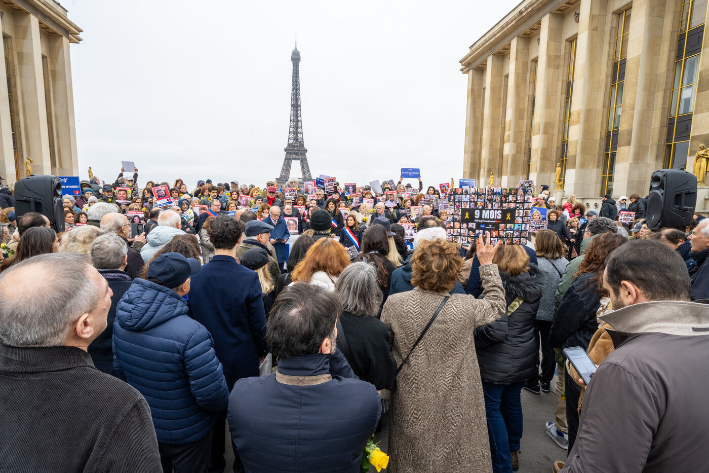 Since the start of the hostage situation following the Hamas terrorist attack on October 7, 2023, a gathering has been held every Friday at the Place du Trocadero in Paris. It will be 9 months on November 9, 2024. The rally on November 8, 2024 was particularly symbolic, as it marked the 399th day of the hostages' captivity. It brought together celebrities and anonymous people carrying placards inscribed with the hashtag BringThemHomeNow and photos of the 101 faces of those still held or who died in detention in Gaza. Yellow roses and sunflowers symbolized hope for the hostages' release. The initiative was led by the collective Les Mères de l'Espoir, with the support of the CRIF and Wizzo France. It will run until the last hostage is freed, every Friday from 12:15 to 12:45.