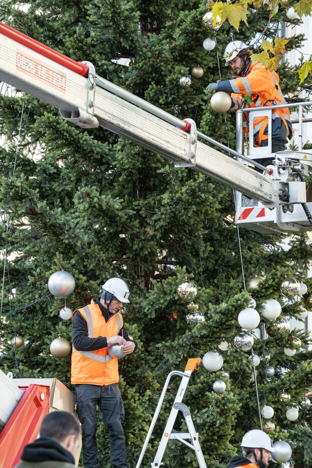 This year's 2024 Christmas illuminations on the Avenue des Champs Elysées in Paris will be marked by the celebration of the Tuileries Gardens balloon bowl that seduced the public during the Paris 2024 Olympics. Decorators prepared the illumination of a huge fir tree before the launch of the Christmas decorations on the avenue des Champs Elysées in Paris from Sunday November 24, 2024 to early January 2025.