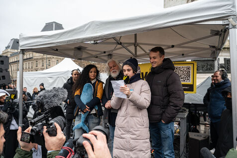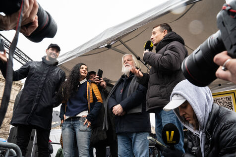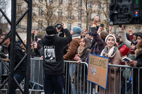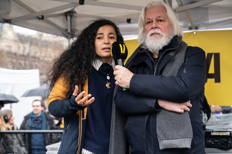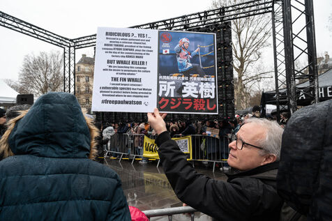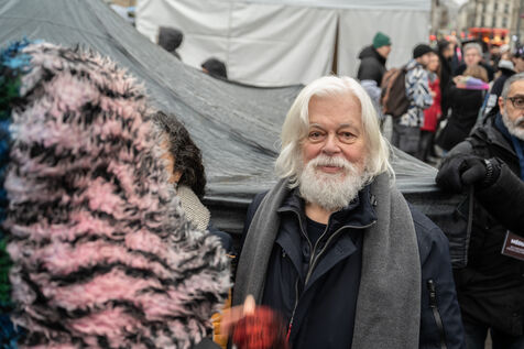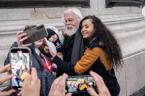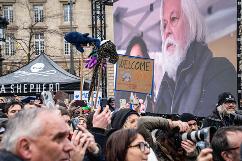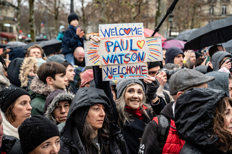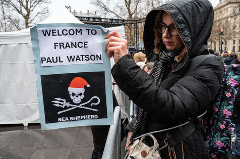 Paul Watson, founder of Sea Shepherd, symbolically celebrates his release with supporters at the Place de la République in Paris, France, on Saturday December 21, 2024. After five months in detention in Denmark, whale conservationist Paul Watson arrived in Paris, France, on Friday December 20, 2024, after his extradition to Japan was refused.