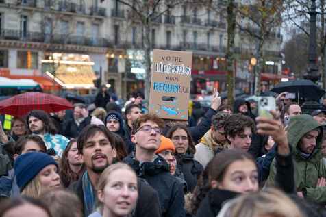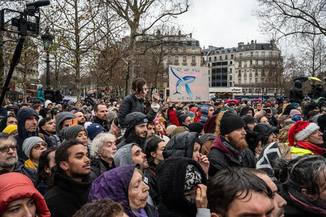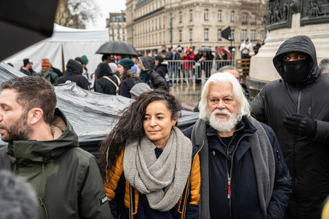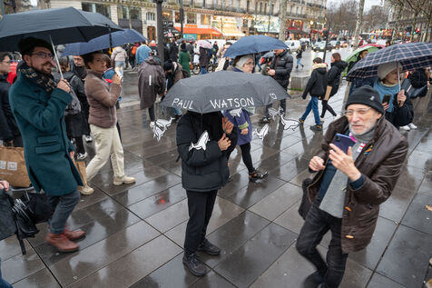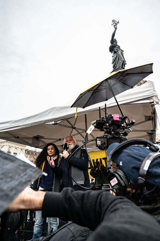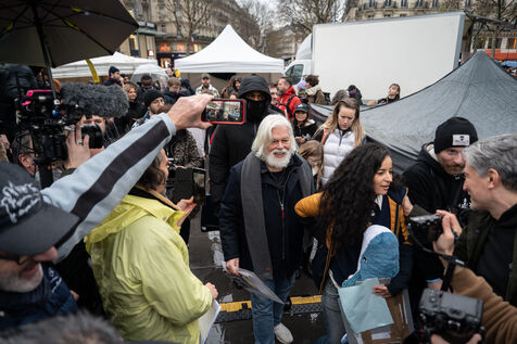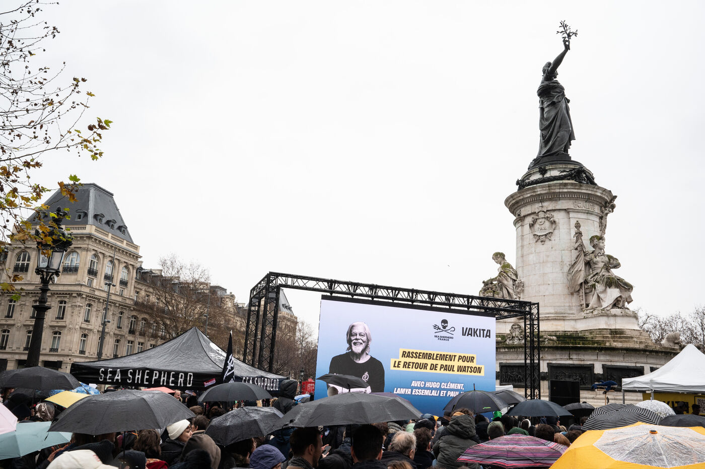 Paul Watson le fondateur de Sea Shepherd célèbre symboliquement sa libération avec ses soutiens sur la Place de la République lors d'un rassemblement à Paris en France le samedi 21 décembre 2024. Apres cinq mois en détention au Danemark le militant écologiste Paul Watson engagé pour la protection des baleines est arrivé a Paris en France le vendredi 20 décembre 2024 après le refus d'extradition vers le Japon.