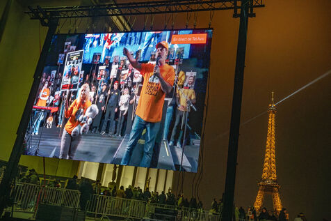 Rassemblement regroupant des anonymes et des personnalités lors d'une reconstitution au Trocadéro à Paris de la Place des Otages de Tel Aviv. A la veille du cesser le feu du 19 janvier, il s'agissait lors de cet évènement pour l'ONG Tous 7 Octobre avec le soutien du Forum des Otages de soutenir les familles des otages du Hamas et réclamer leur libération. La Place des Otages est une place publique de Tel Aviv en Israël où les familles des otages et leurs sympathisants se rassemblent depuis l'attaque du 7 octobre 2023.
