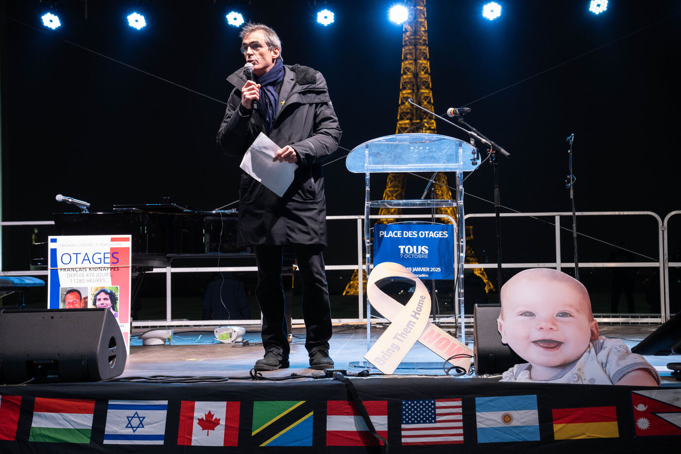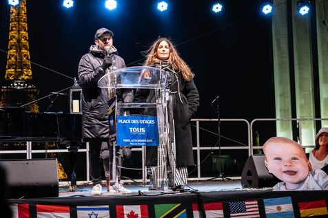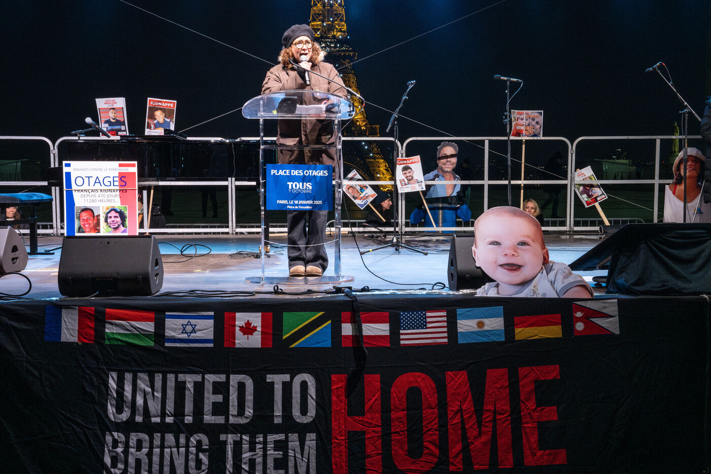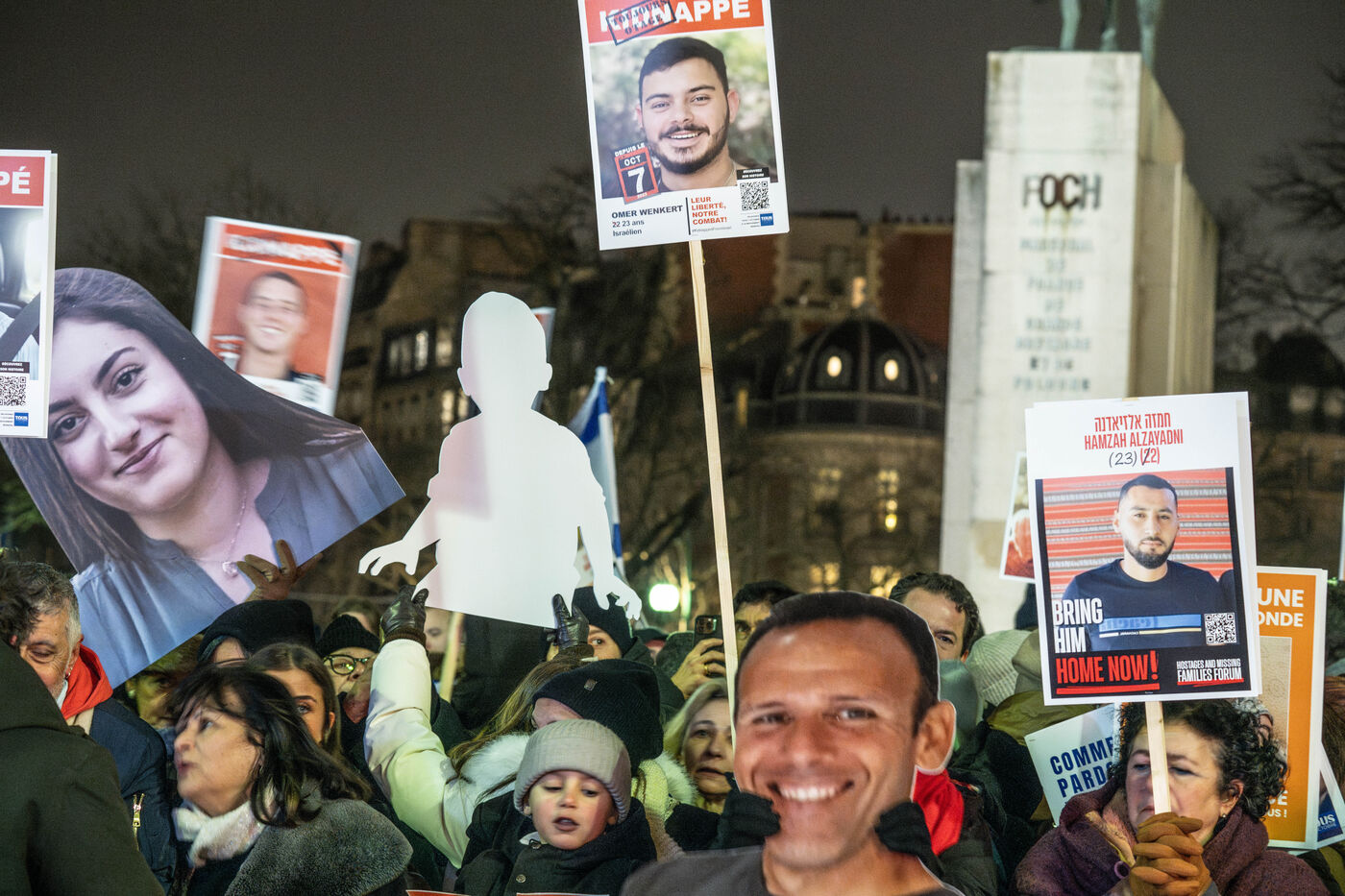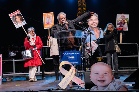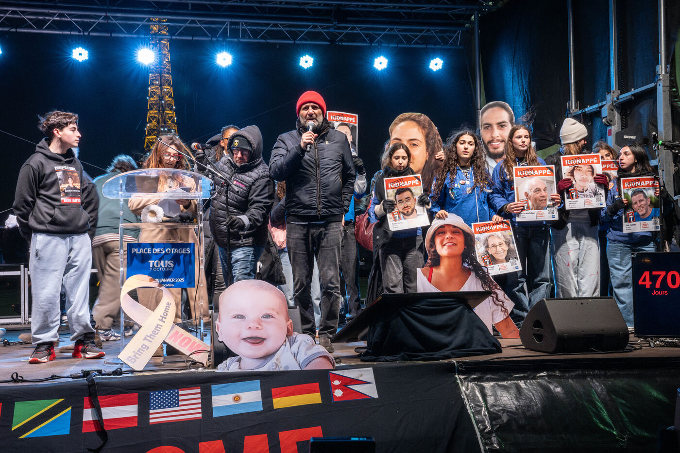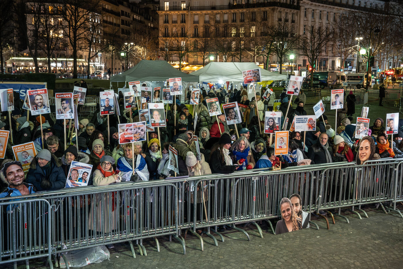 Gathering of anonymous people and celebrities at a re-enactment of Tel Aviv's Place des Otages at the Trocadéro in Paris. On the eve of the January 19 ceasefire, the event was organized by the NGO Tous 7 Octobre, with the support of the Forum des Otages, to support the families of the Hamas hostages and demand their release. Place des Otages is a public square in Tel Aviv, Israel, where the families of the hostages and their supporters have been gathering since the attack on October 7, 2023.