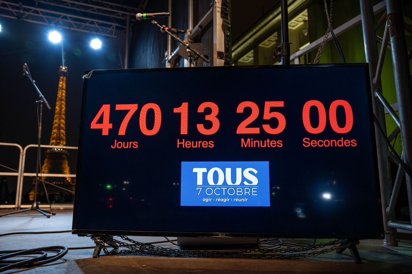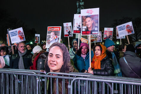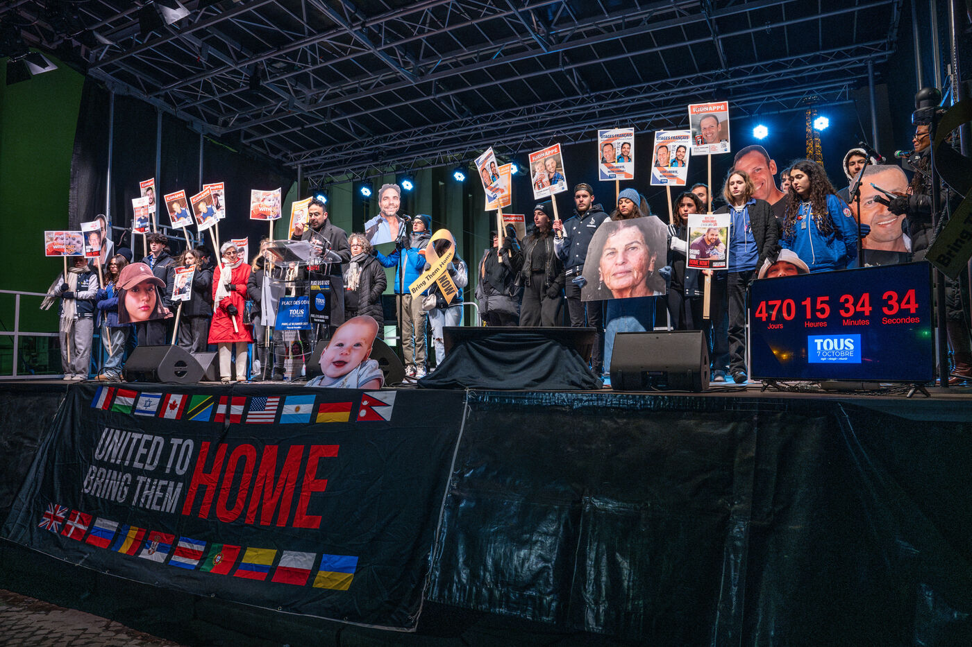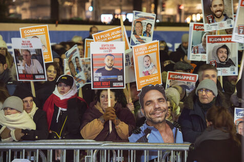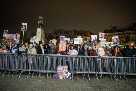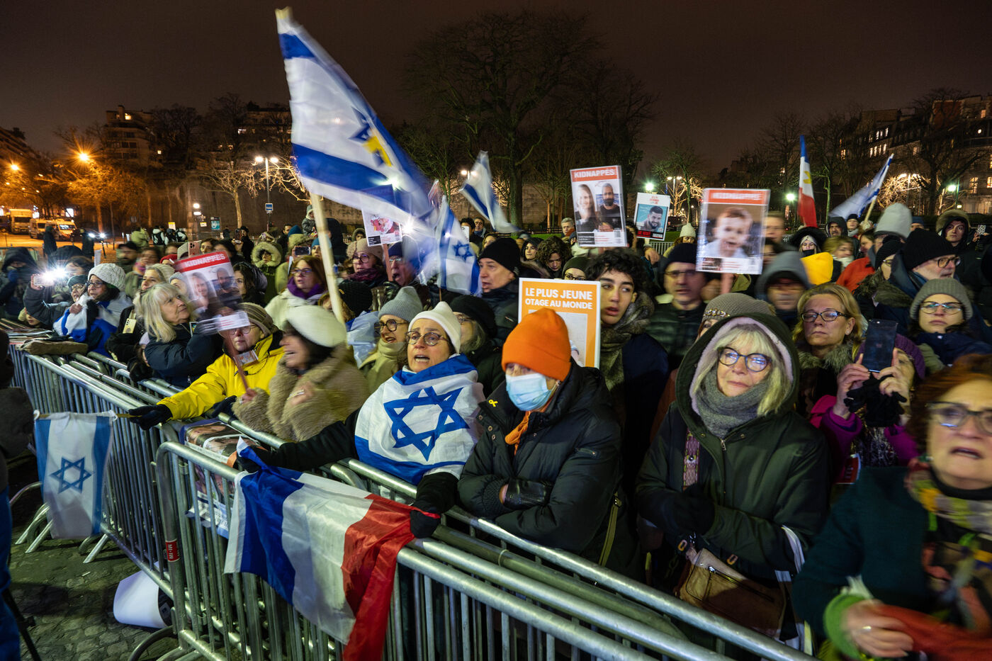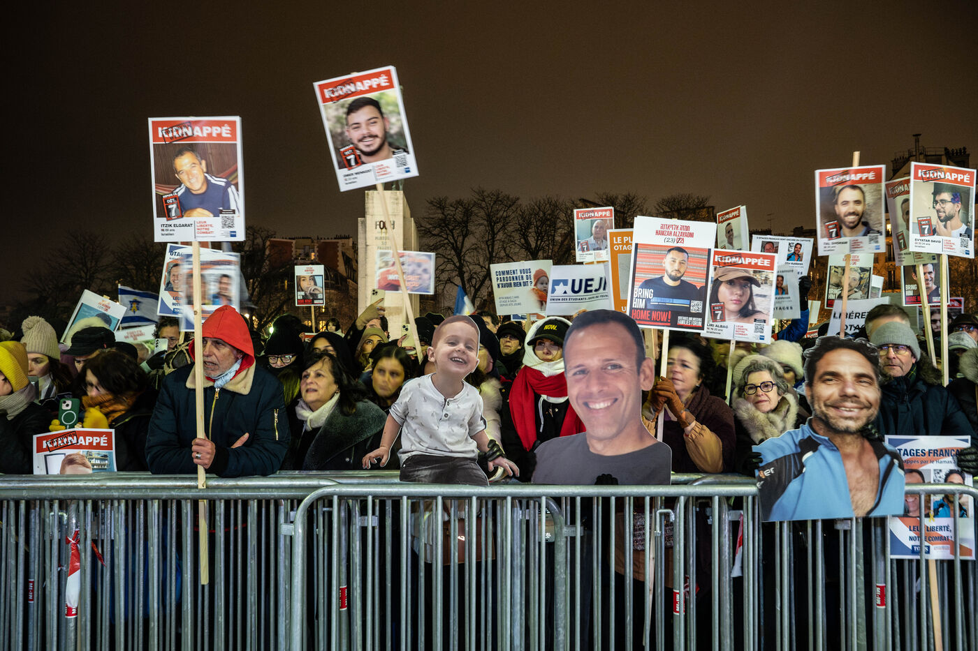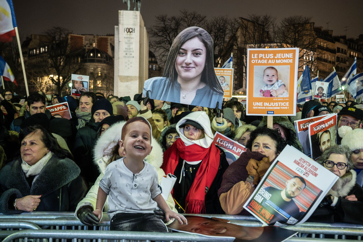 Gathering of anonymous people and celebrities at a re-enactment of Tel Aviv's Place des Otages at the Trocadéro in Paris. On the eve of the January 19 ceasefire, the event was organized by the NGO Tous 7 Octobre, with the support of the Forum des Otages, to support the families of the Hamas hostages and demand their release. Place des Otages is a public square in Tel Aviv, Israel, where the families of the hostages and their supporters have been gathering since the attack on October 7, 2023.