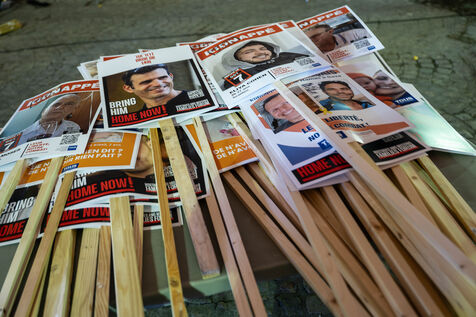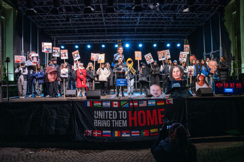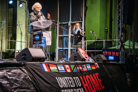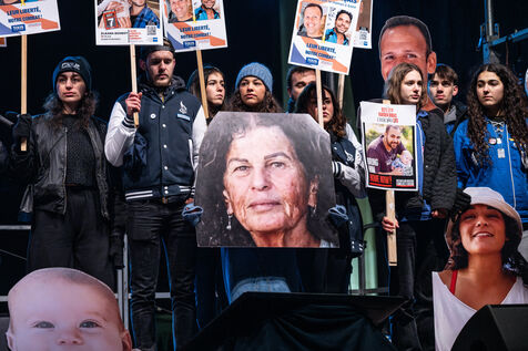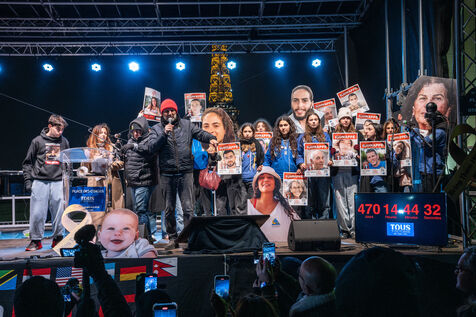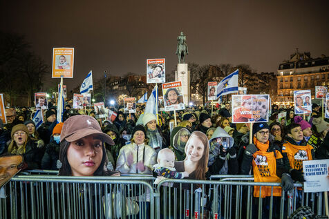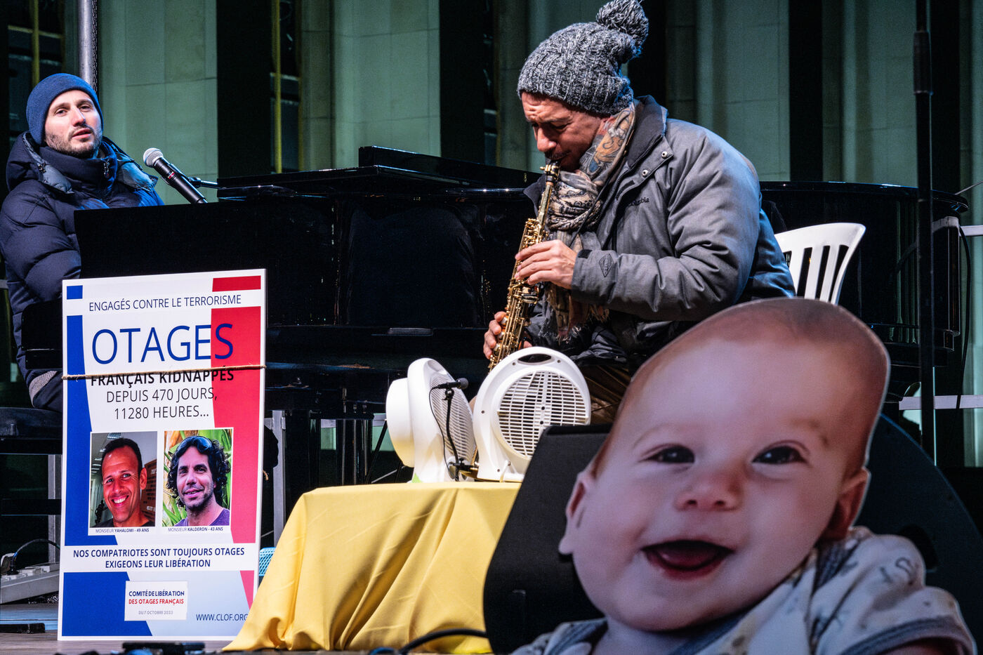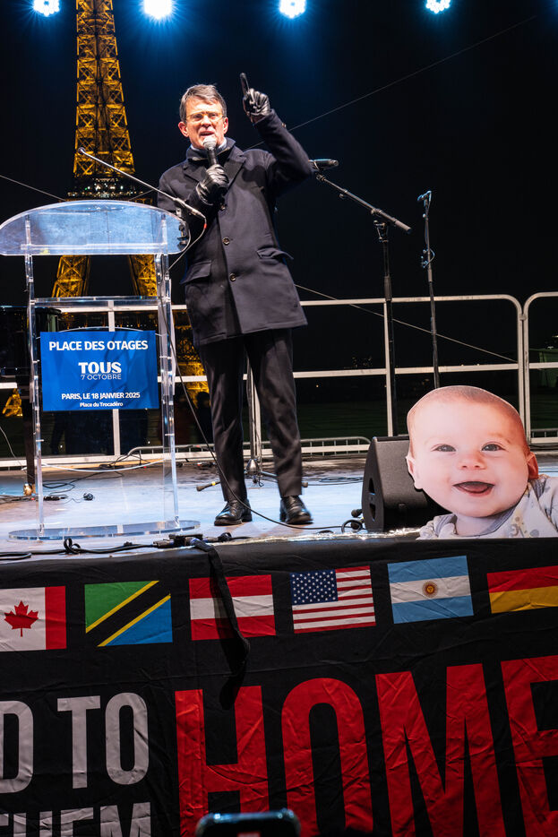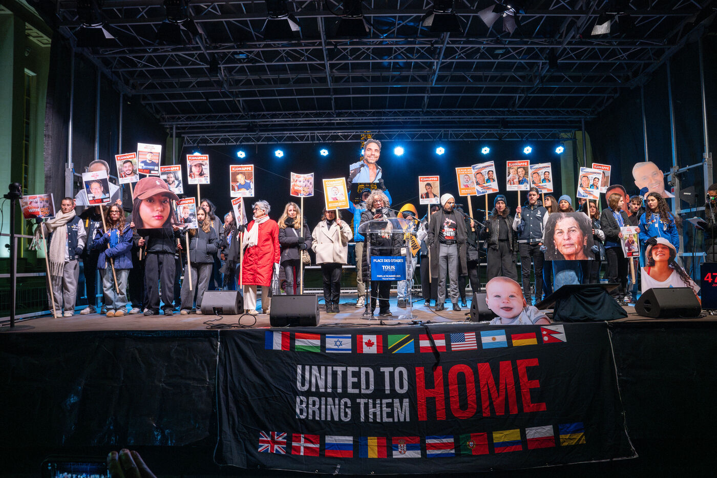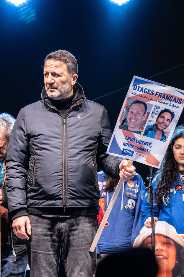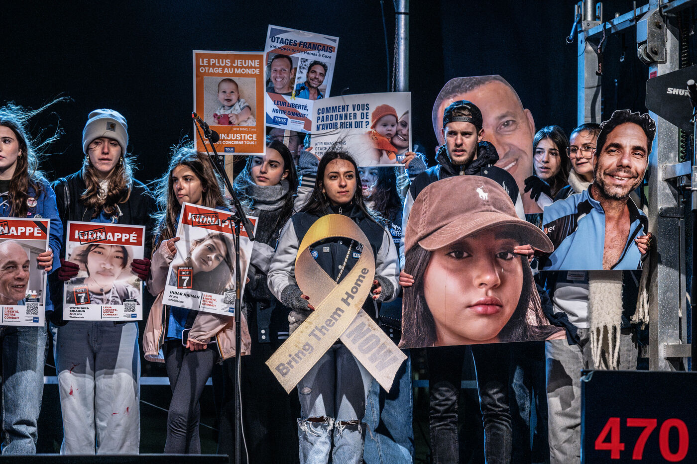 Gathering of anonymous people and celebrities at a re-enactment of Tel Aviv's Place des Otages at the Trocadéro in Paris. On the eve of the January 19 ceasefire, the event was organized by the NGO Tous 7 Octobre, with the support of the Forum des Otages, to support the families of the Hamas hostages and demand their release. Place des Otages is a public square in Tel Aviv, Israel, where the families of the hostages and their supporters have been gathering since the attack on October 7, 2023.
