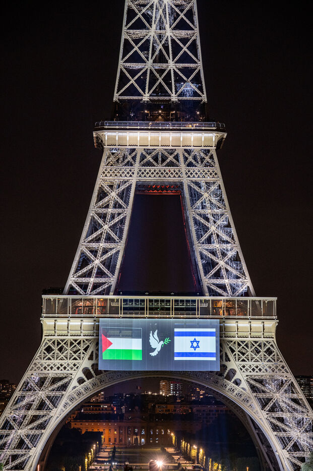 La projection de la mairie de Paris du 21 septembre 2025 sur la Tour Eiffel d'une image réunissant les drapeaux palestinien (G) et israélien (D) avec une colombe tenant un rameau d'olivier, intervient a la veille de la réunion de l'assemblée générale de lONU consacrée a la reconnaissance de l'Etat de Palestine par plusieurs pays dont la France.