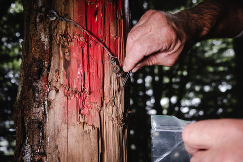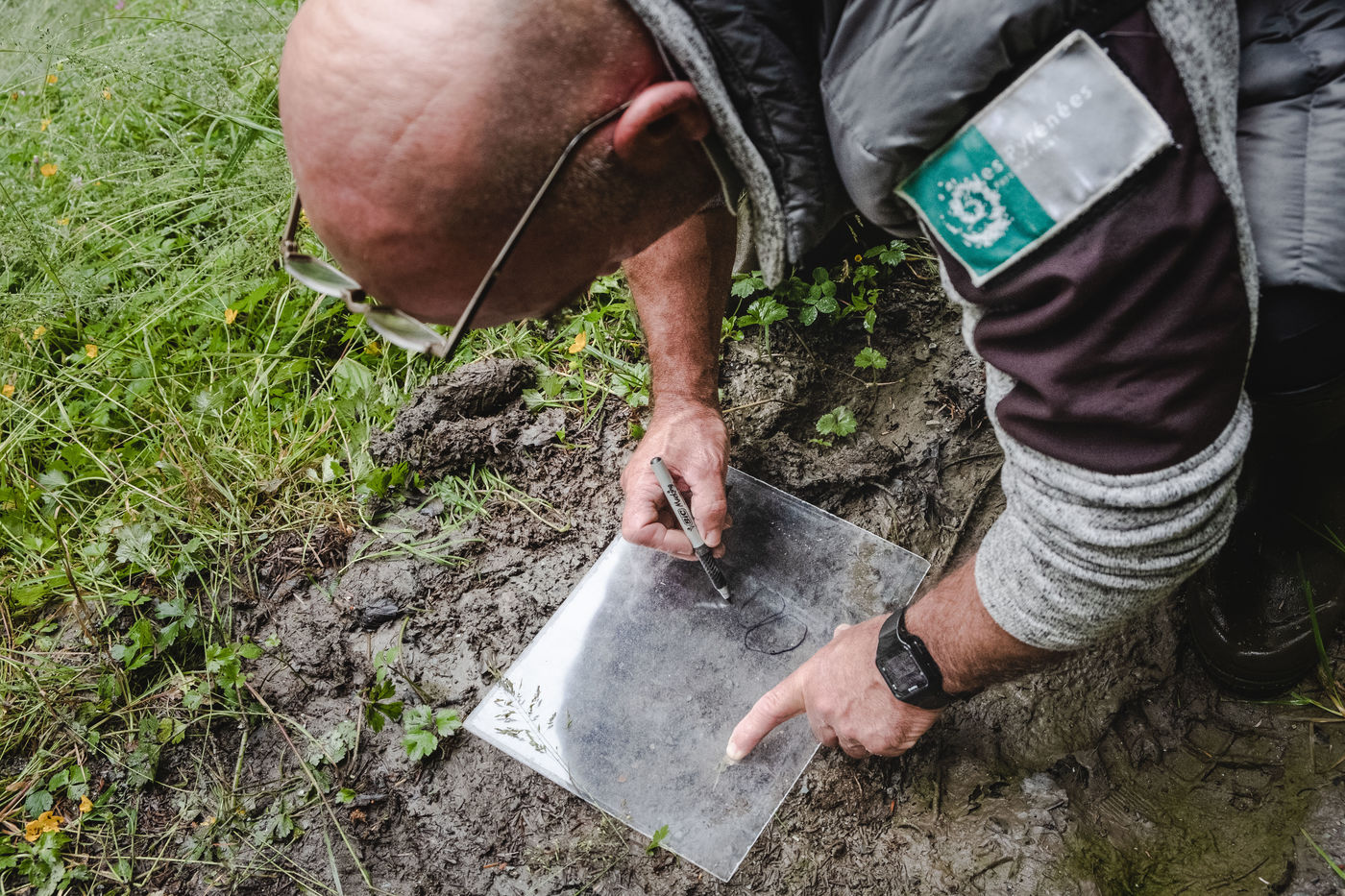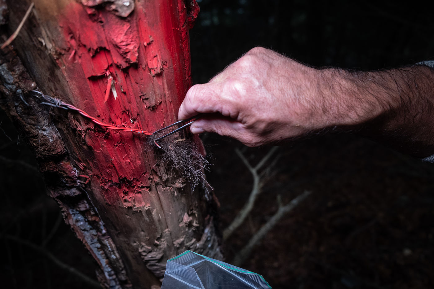 Patrick, guard monitor at the Pyrenees National Park, is doing a bear tour in the Lisey forest. He was informed by a resident of Cauterets of the potential presence of a bear in the area. As he goes into the woods, he finds an imprint of the bear's left front paw, scratches on a tree trunk and hair hanging in the same place. He then goes to pick up hairs from a trap, which consists of a beard and smola, an attractive smelling product. The bear has indeed been there. Carefully, the guard retrieves the hairs from the plantigrade and takes measurements of the animal's paw. In a few months, the results of the laboratory research will make it possible to identify the individual.