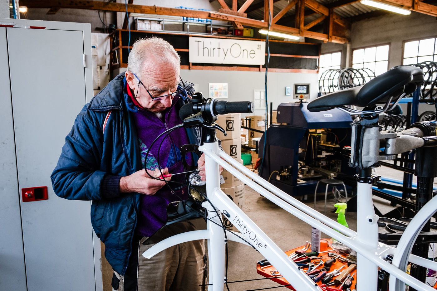 En 2014, Christophe Baeza a créé une entreprise de fabrication de vélos électriques en France, Thirty One Bikes, grâce notamment au soutien de la région Occitanie. Aujourd'hui, sa petite entreprise est en pleine expansion et le chef d'entreprise va donc logiquement augmenter ses recrutements pour pouvoir répondre à la forte demande qui s'est accrue avec les confinements successifs et la pandémie de coronavirus. Jean-Marie, salarié, travaille sur la chaîne d'assemblage des vélos et peut assembler un vélo en une heure environ. A Villeneuve de Riviere, Haute-Garonne, le 6 avril 2021.