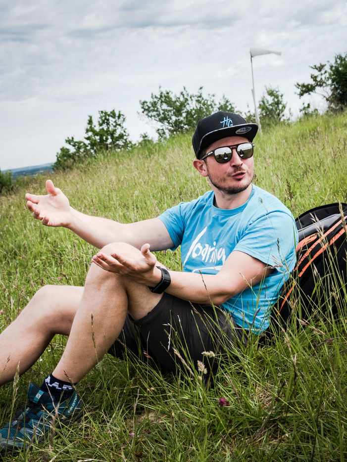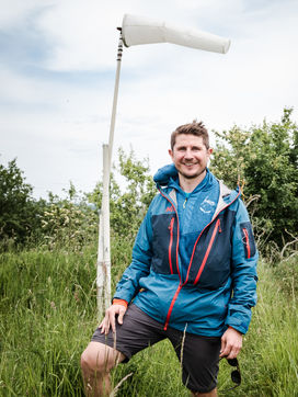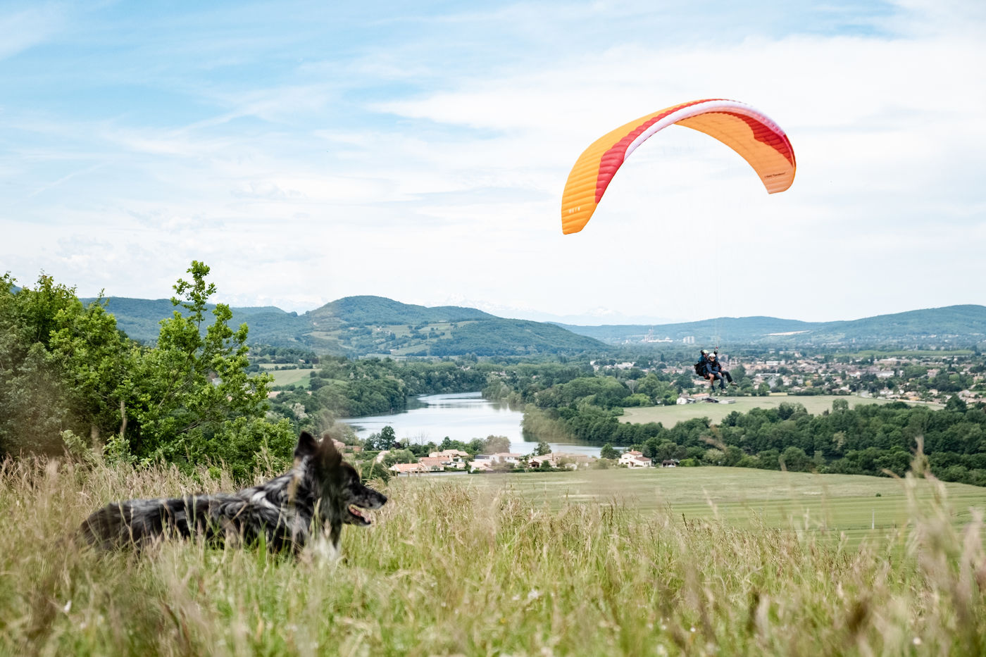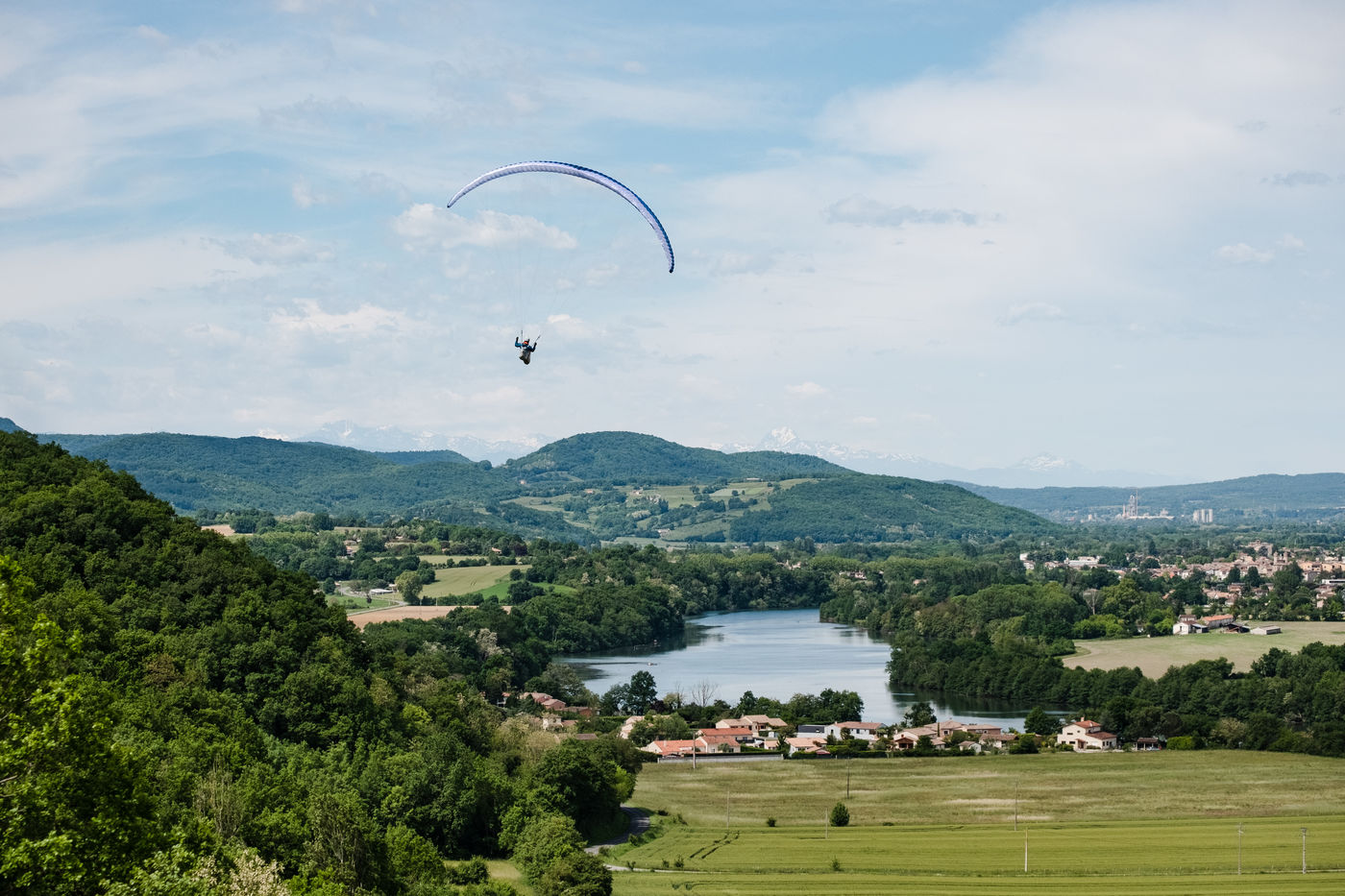 Portrait of paraglider Thibaut Vargas. He regularly participates in international competitions and is one of the top three paragliders in the Pyrenees. On this day he is training above the Garonne river and tries to stay in the air as long as possible despite the unfavourable winds. He also shows his passion to curious people and friends in the south west of France by giving them a tandem flight.