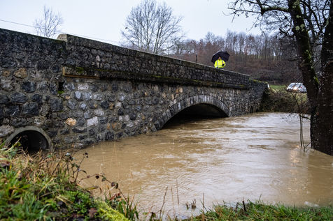 France, Occitanie, Haute-Garonne, Cassagne, 2022-01-10. Fort épisode de pluie dans le sud ouest de la France. Certaines routes du village sont fermées d'accès car les cours d'eau sont en crue. Les villageois viennent observer les inondations depuis les ponts.