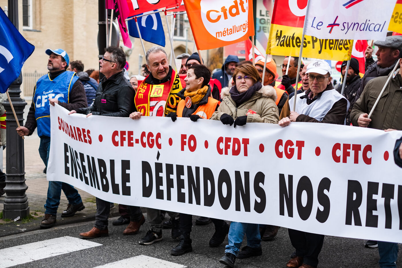Manifestation dans le cadre de la journée nationale de grèves et de rassemblements pour protester contre un projet de reforme visant à faire passer l'âge de la retraite de 62 à 64 ans. France,Tarbes, 2023-02-07.