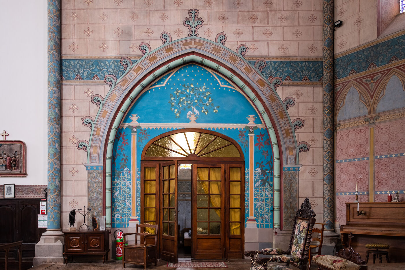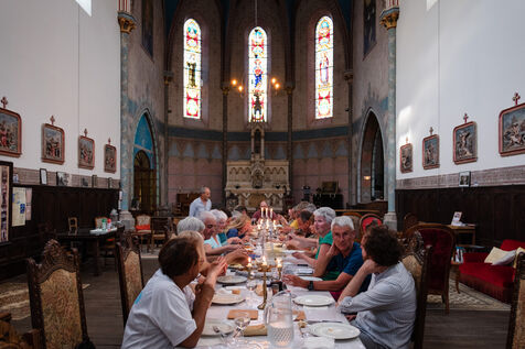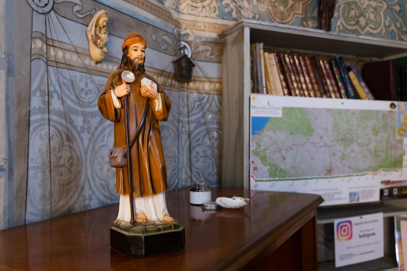 "Marie-Noëlle, who has just dropped off her walking shoes and walking stick at the reception desk of the Ursulines chapel, now converted into a stopover gîte, declares straight away: "This place is a challenge... just as the Pilgrim's Way to Santiago de Compostela is a challenge to us! It's 4pm on this late May afternoon, and the pilgrims are starting to arrive after a final steep climb on the outskirts of Aire-sur-l'Adour (Landes). "You won't have to climb it tomorrow morning," Didier Jouaret kindly consoles the out-of-breath pilgrims. He is the proud owner of this chapel, which once belonged to the teaching order of Ursuline nuns but was desecrated in 1973, and which he bought from a private individual in 2017. From the moment you enter the north side chapel, splendid nineteenth-century murals draw a trompe-l'?il curtain of blue and gold along the walls.