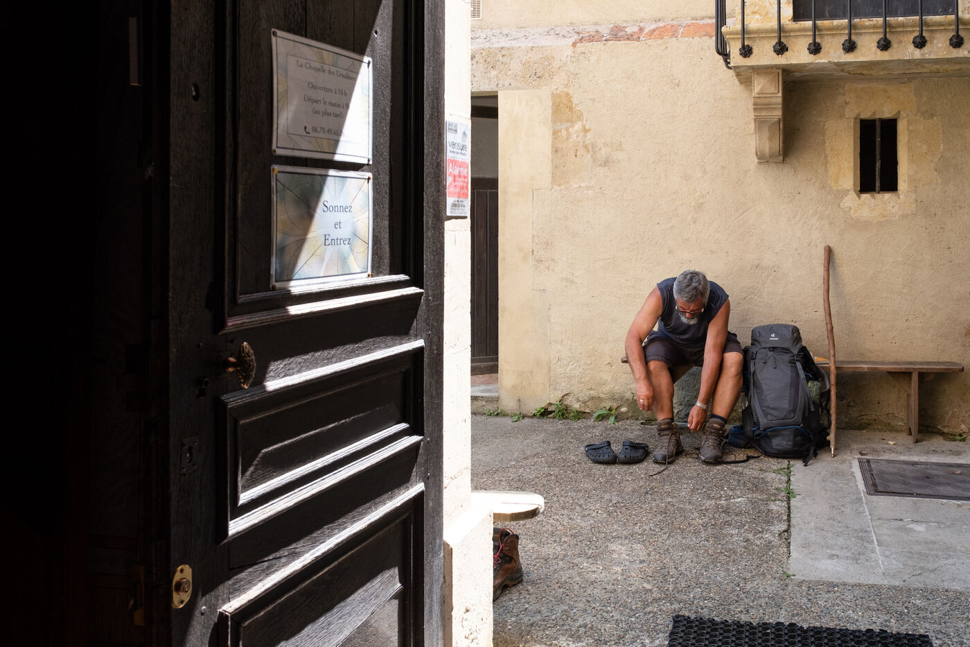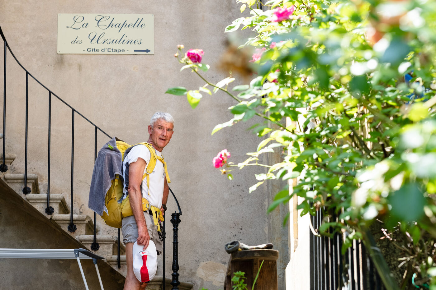 "Ce lieu bouscule... comme le chemin de Compostelle en lui-même nous bouscule!" déclare d'emblée Marie-Noëlle, qui vient de déposer chaussures de marche et bâton à l'accueil de la Chapelle des Ursulines, désormais convertie en gîte d'étape. Il est 16 heures et, en cet après-midi de fin mai, les pèlerins commencent à arriver, après une dernière montée bien raide, à la sortie d'Aire-sur-l'Adour (Landes). "Vous n'aurez pas à la grimper demain matin!" console ans1873 2023 gentiment Didier Jouaret en accueillant les plus essoufflés. Il est l'heureux propriétaire de cette chapelle ayant appartenu à l'ordre enseignant des religieuses ursulines mais désacralisée en 1973, et qu'il a rachetée à un particulier en 2017. Les arrivants laissent échapper un murmure de surprise admirative: dès l'accueil, dans la chapelle latérale nord de l'édifice, de splendides peintures murales du XIX e siècle dessinent un rideau en trompe-l'oeil, bleuté et or, le long des murs.
