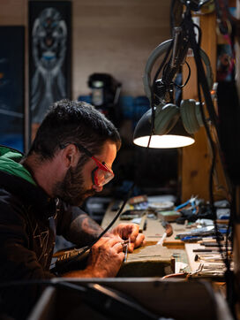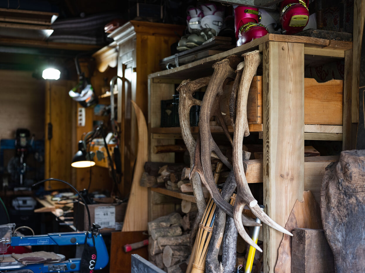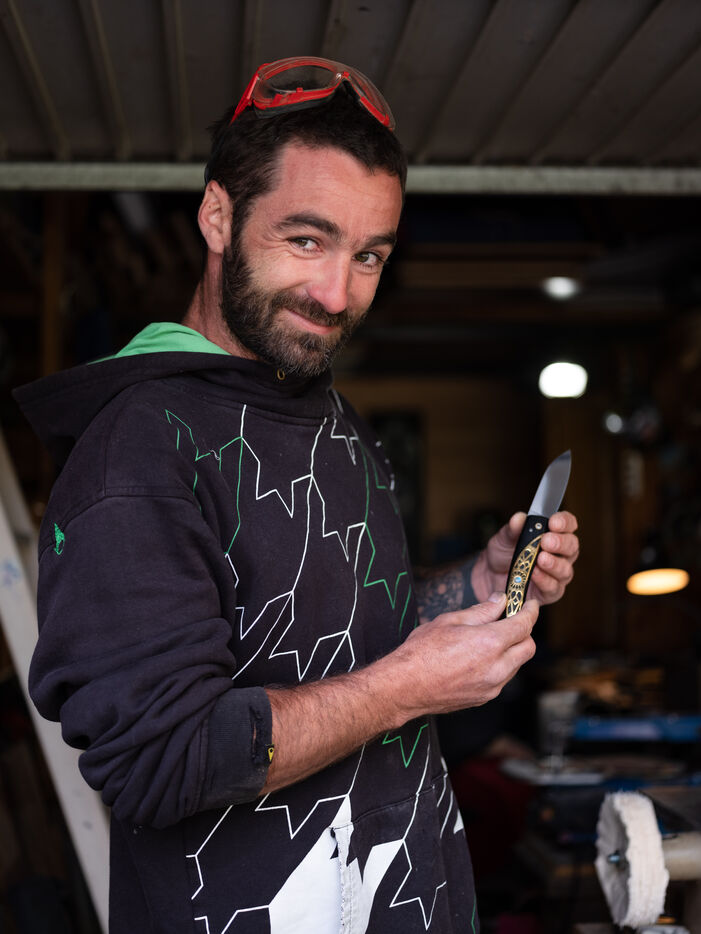 Les étagères fourmillent d'essences de bois diverses, de lames en acier de Damas, de matières premières et de matériel de menuiserie et d'orfèvrerie, allant de petites fraises à de grosses machines pour couper et polir. Sur son établi, quelques pièces en cours de finition, tous ces modèles uniques répondent à des commandes passées par ses clients. Le coutelier a débuté son activité en 2019. C'est son beau-père qui travaillait des couteaux de bergers le soir, sa belle-mère lui a confié une boîte avec quelques bouts de bois à l'intérieur sur lesquels il a commencé à s'exercer.