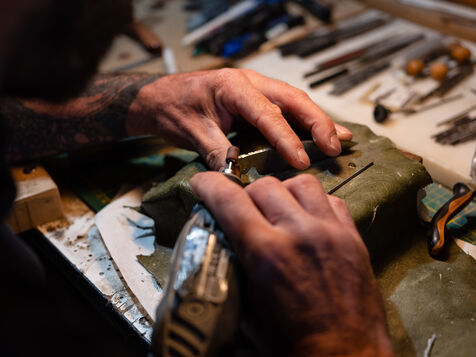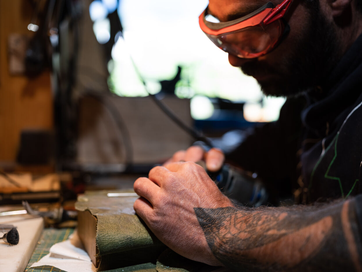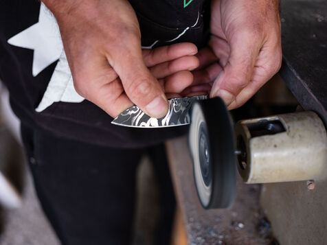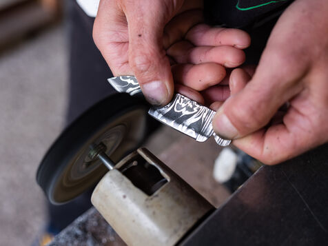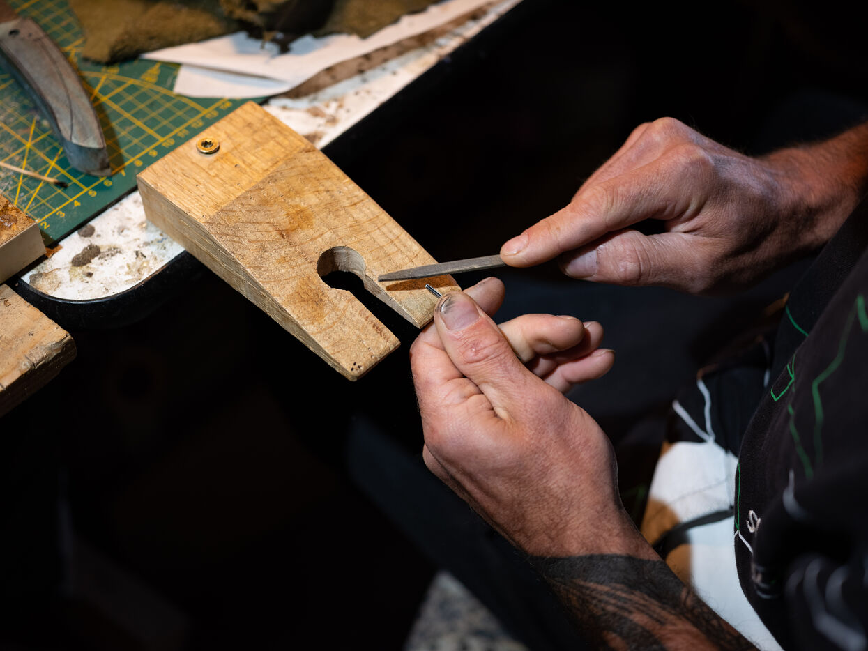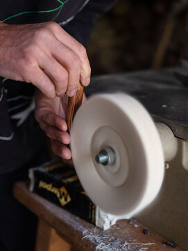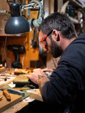 The shelves are crammed with various types of wood, Damascus steel blades, raw materials and carpentry and goldsmithing equipment, from small milling cutters to large cutting and polishing machines. On his workbench, a few pieces in the process of being finished, all these unique models respond to orders placed by his customers. The cutler started his business in 2019. His father-in-law used to work on shepherd's knives in the evenings, and his mother-in-law gave him a box with a few pieces of wood inside on which he began to practise.