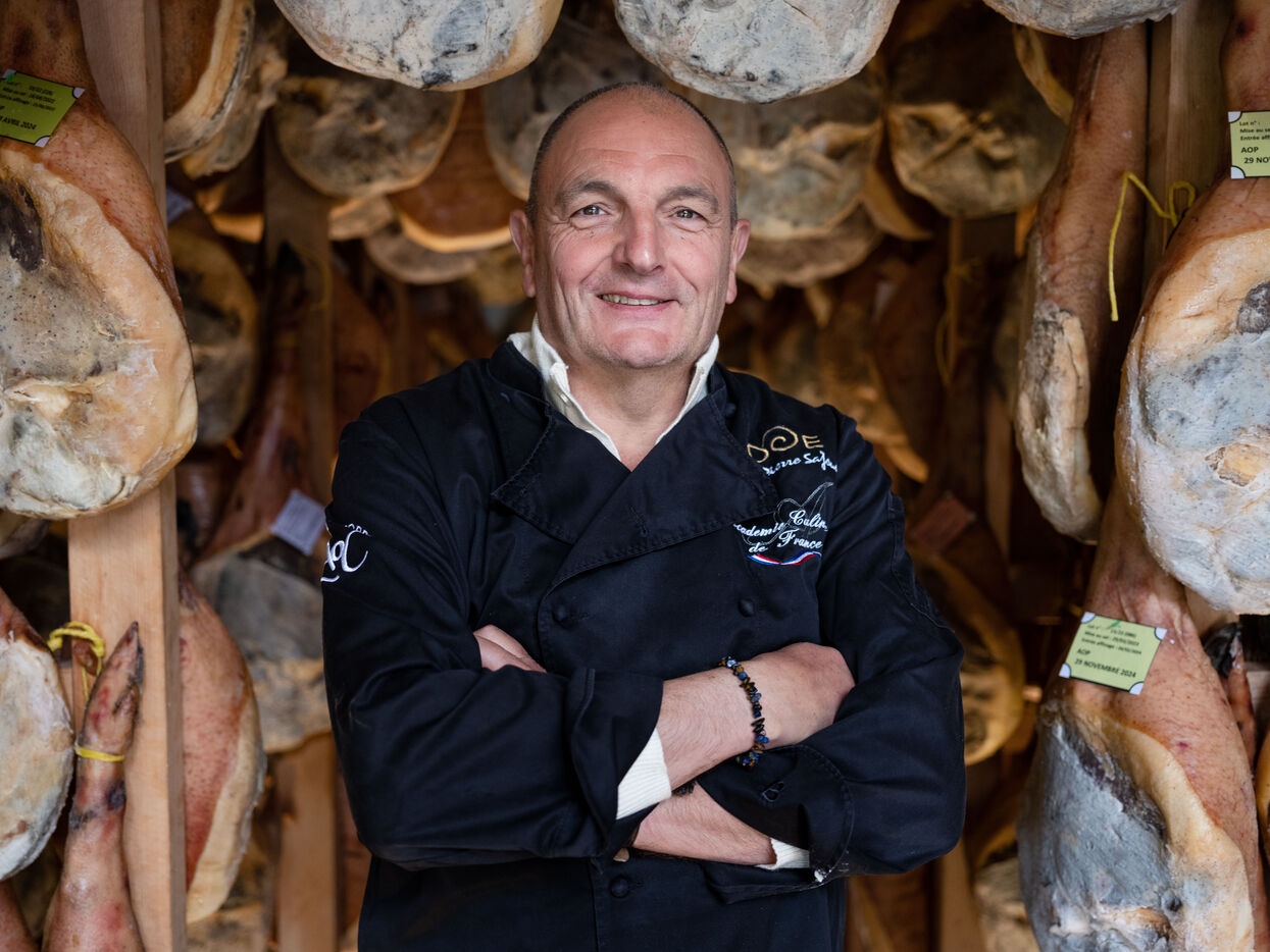 From a small delicatessen in Argelès-Gazost, Pierre Sajous' company, now based in Beaucens, produces up to 350 tonnes of finished products every year. In its maturing cellar, between 800 and 1,000 black Bigorre hams are aged.
