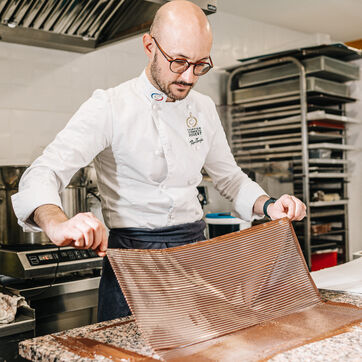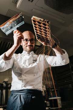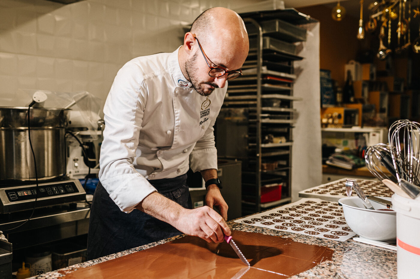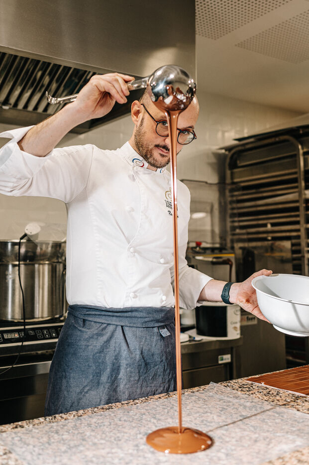 Rémi Touja, a patissier in Carcassonne, works with chocolate in his laboratory. He won the title of French Dessert Champion in 2013. With the festive season just around the corner, demand is growing fast.
