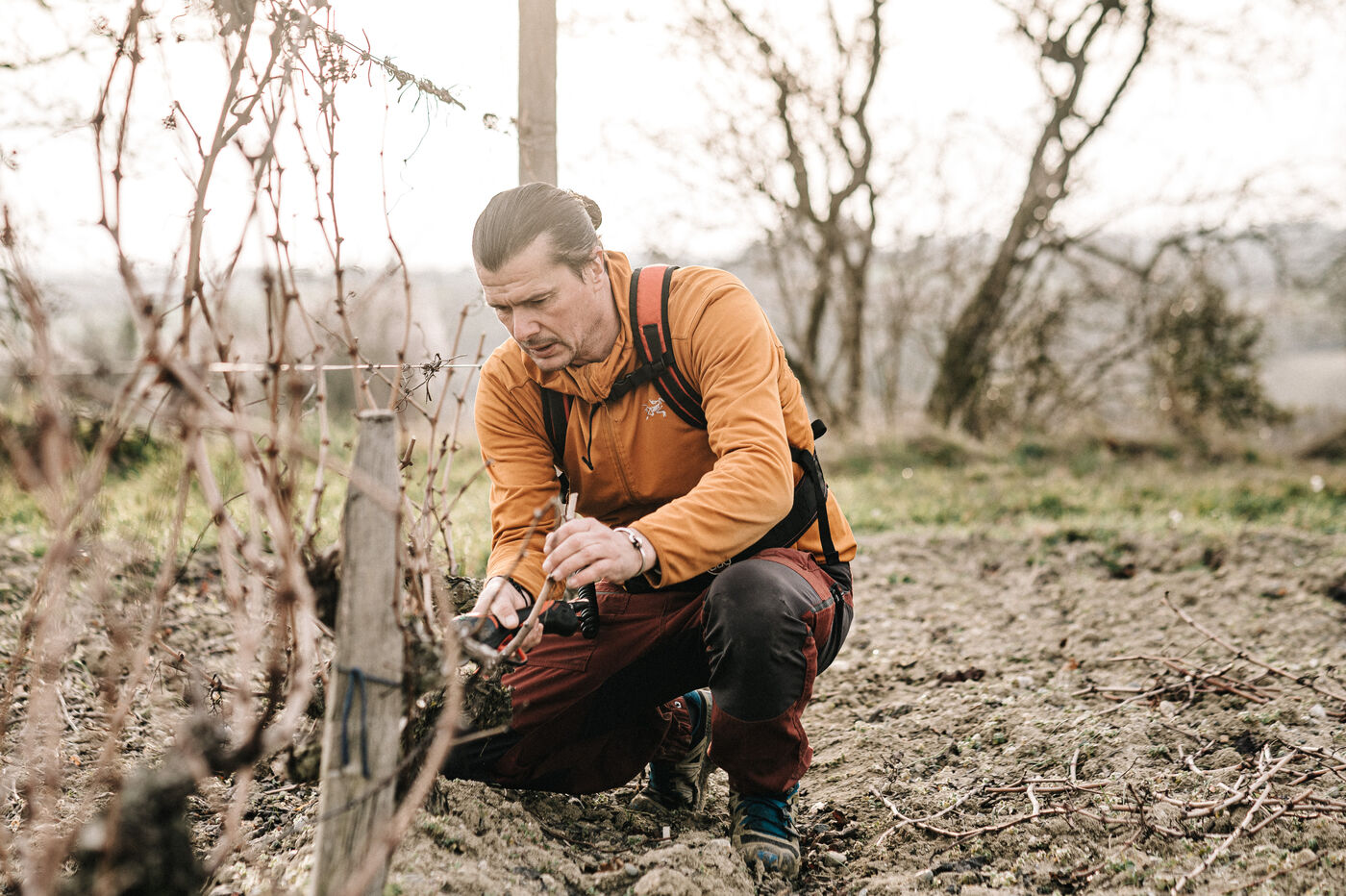 Frédéric Palacios du Domainde de mon Père (AOP Malepère) taille la vigne. Avec son approche de la viticulture il est un des précurseurs dans le monde des vins natures dans l'Aude.