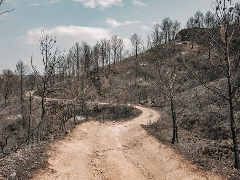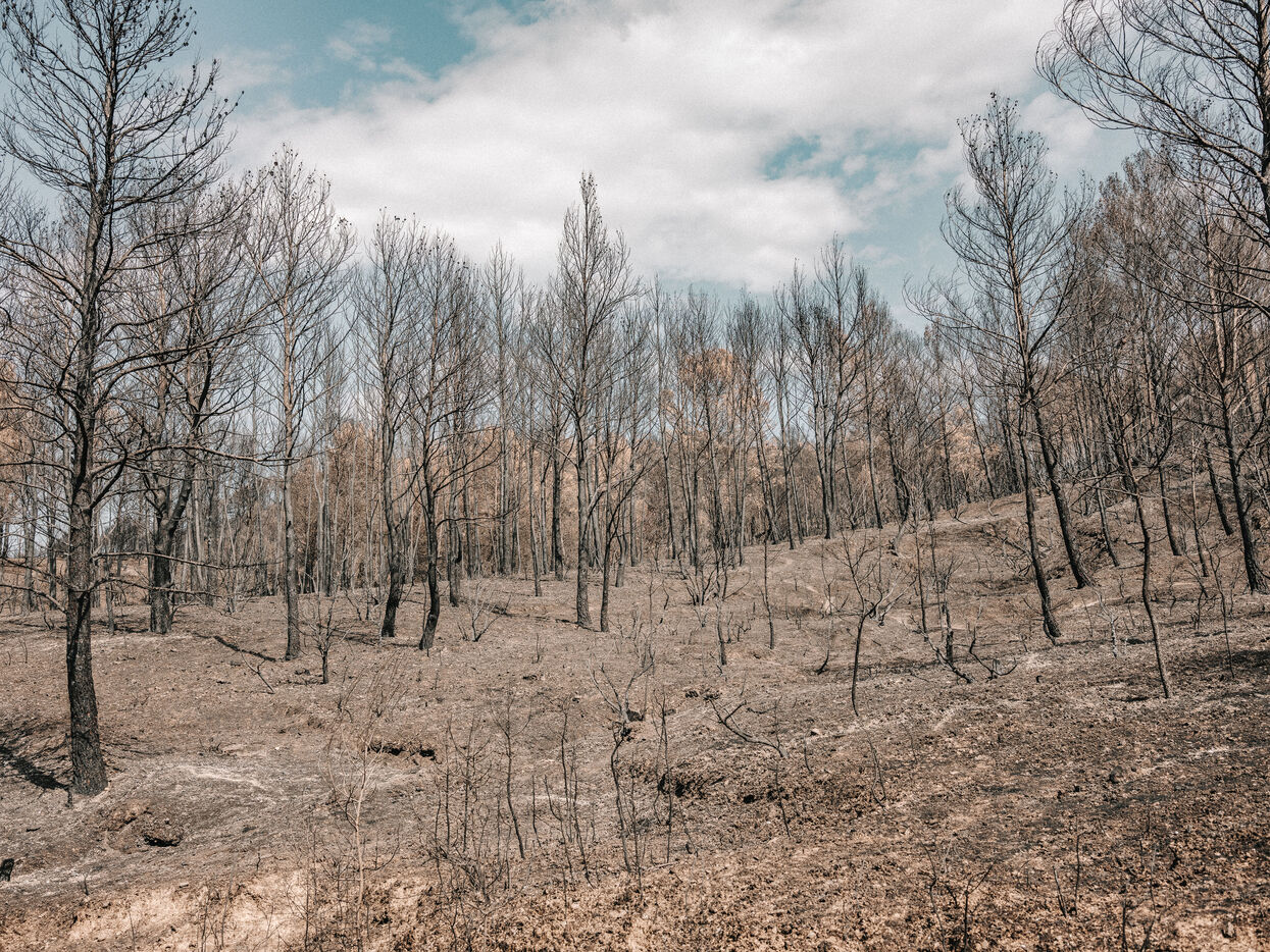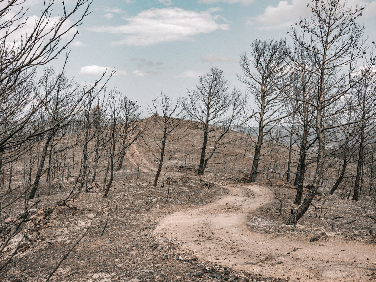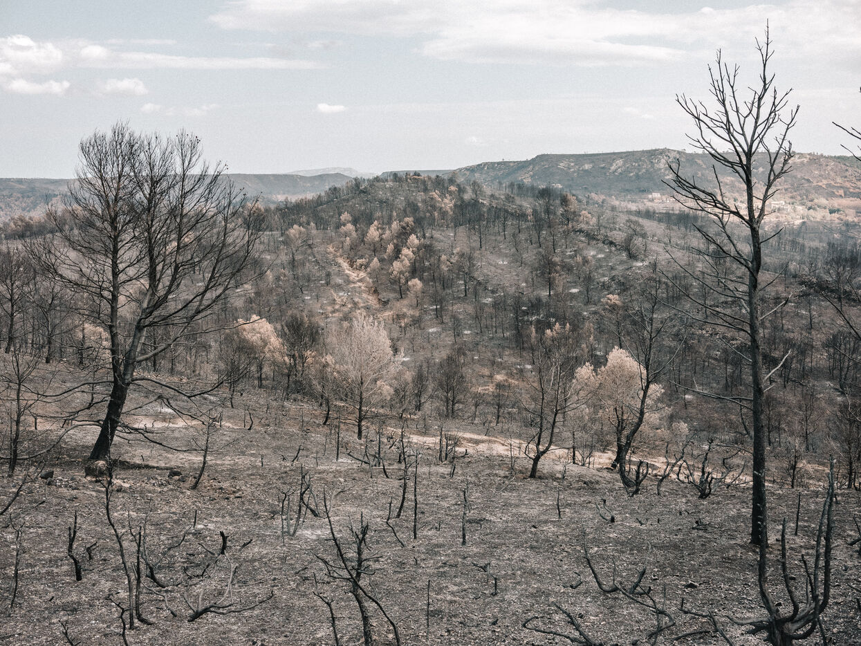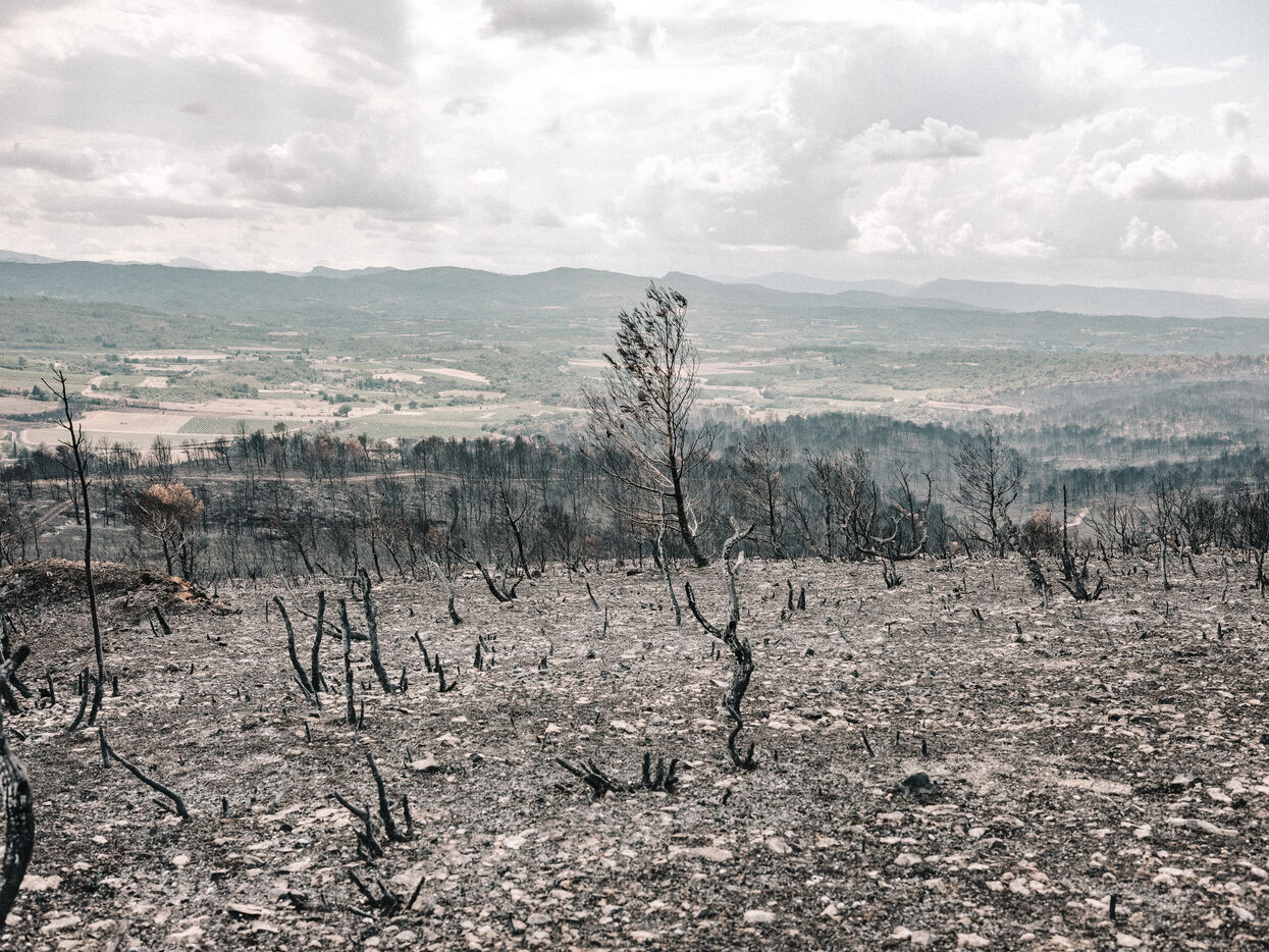 Paysages du Massif des Corbières après l'incendie d'août 2025. 17 000 hectares ont été brulés en quelques jours ce qui fait de cet incendie le plus important en France depuis 80 ans.