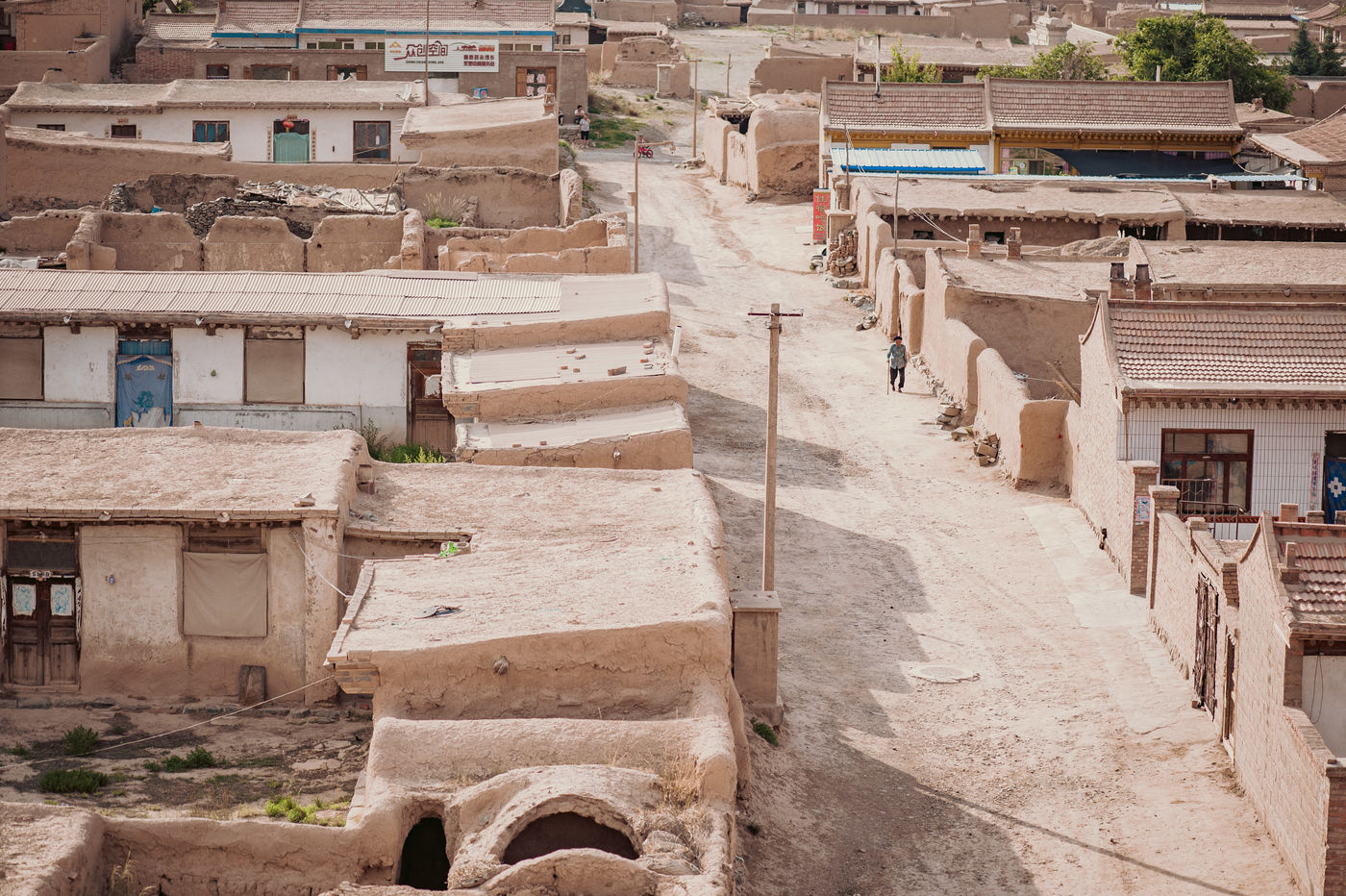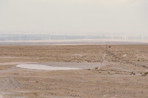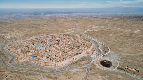 Nous sommes sur un plateau à 2100 mètres d'altitude au pied des monts Qilian et le désert de sable du Tenggeli est à moins de 100 km. Le climat est rude ici. Très chaud en été et glacial en hiver, Yongtaï est constamment balayée par des vents puissants. D'ailleurs les autorités ne s'y sont pas trompées, et depuis que la Chine a décidé de rentrer dans le concert des nations qui oeuvrent contre le réchauffement climatique, les forêts d'éoliennes ont remplacé les conifères d'avant et des hectares de champs de panneaux solaires sont désormais les cultures d'avant-garde (Pour rappel, en 2015, le Gansu a installé en 4 mois autant de panneaux solaires qu'en compte la France).